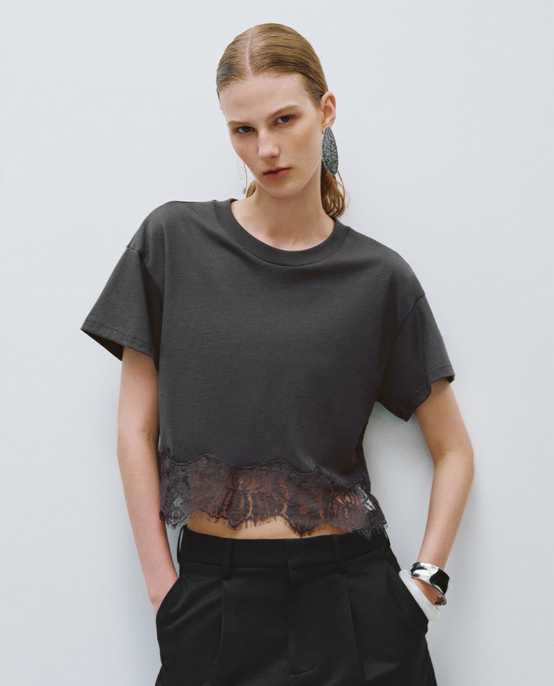Áo kiểu nữ cổ tròn tay ngắn phối ren