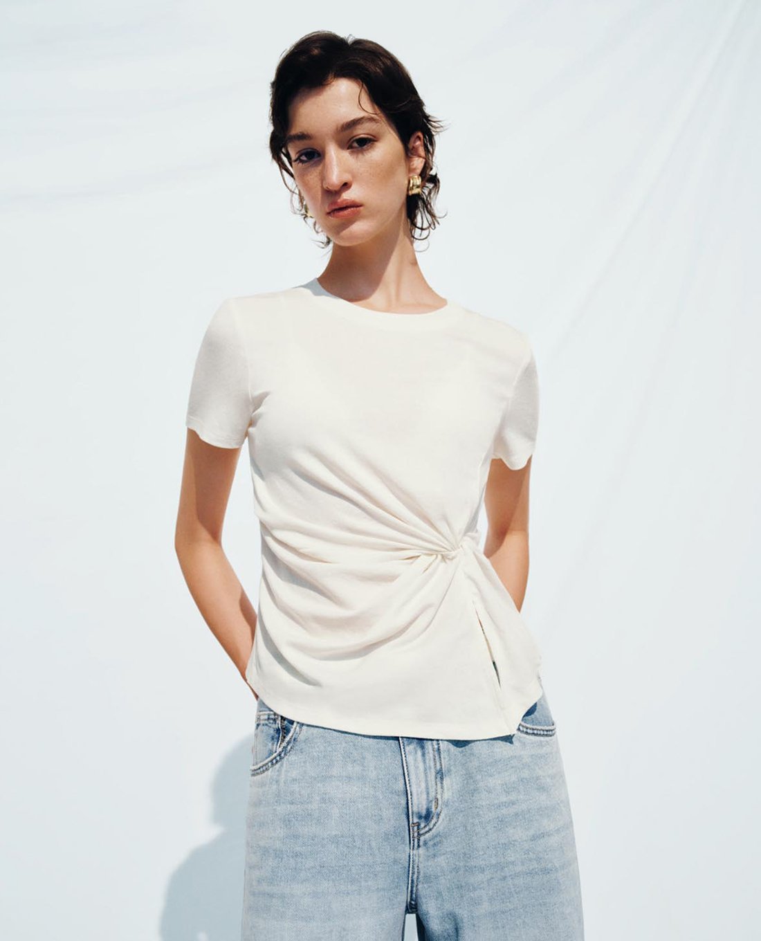 Áo kiểu nữ cổ tròn tay ngắn xếp nếp