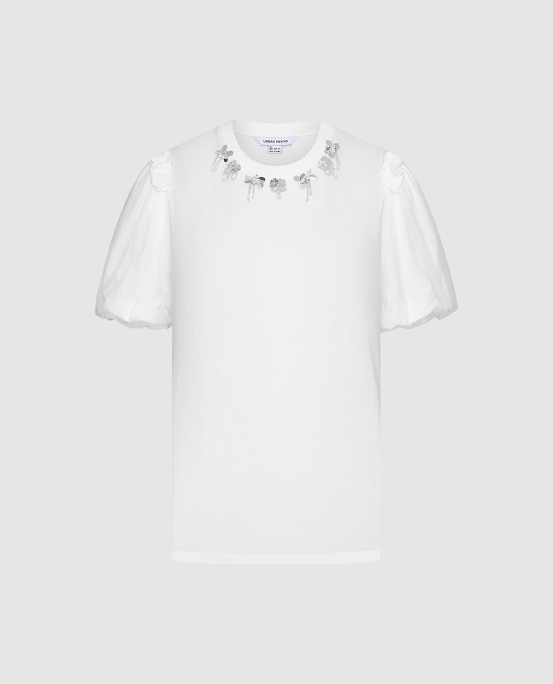 Áo kiểu nữ cổ tròn tay phồng đính hoa nổi