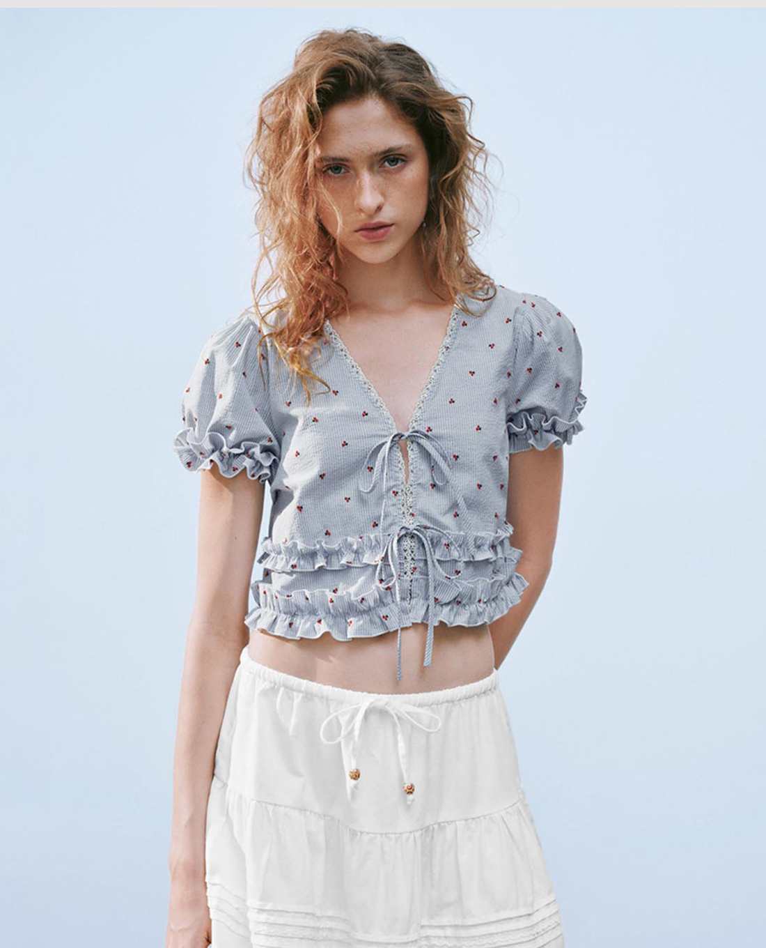 - Thiết kế tay bồng nhấn bèo tầng ở thân và tay áo mang lại vẻ nữ tính