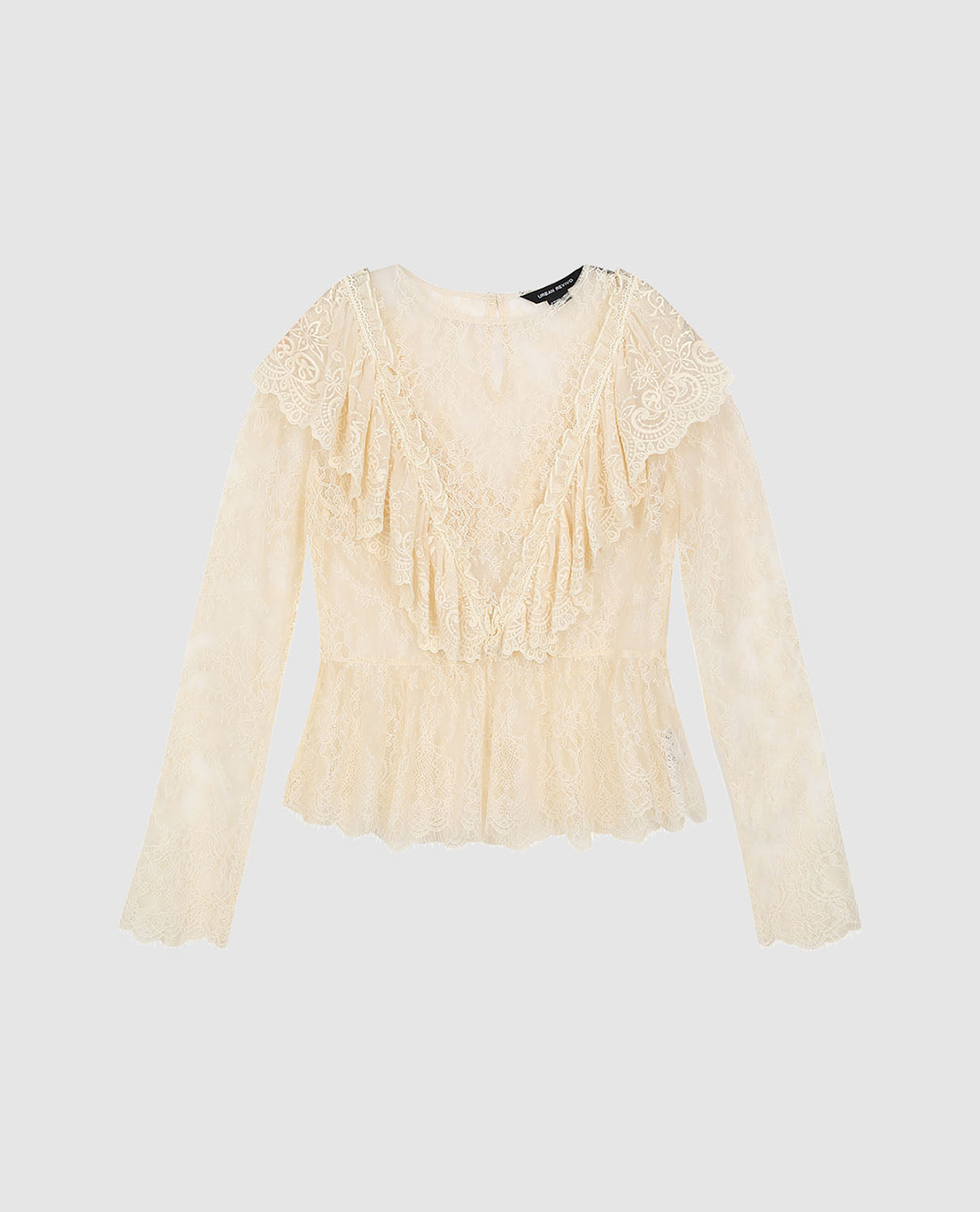 Áo kiểu nữ cổ V tay dài nhún bèo Ruffle Hem