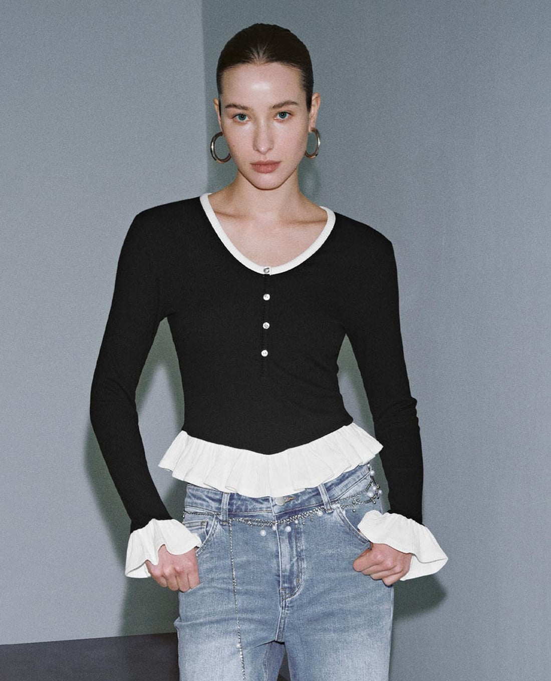 - Gấu và tay áo phối bèo tăng nét nữ tính, duyên dáng