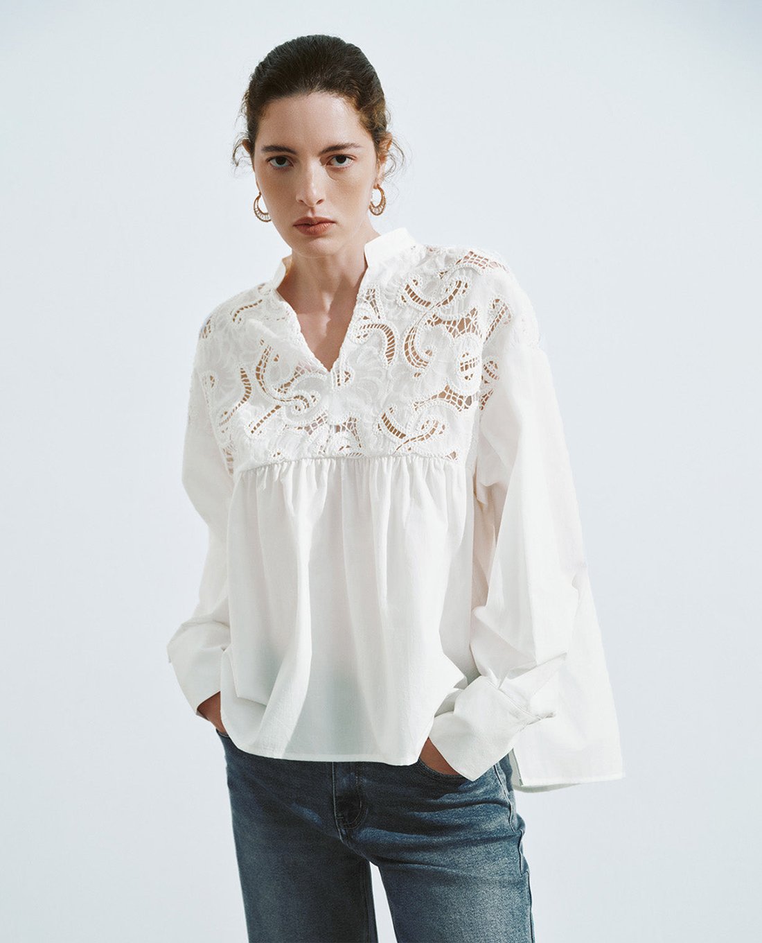 Áo kiểu nữ cổ V tay dài phối ren thời trang