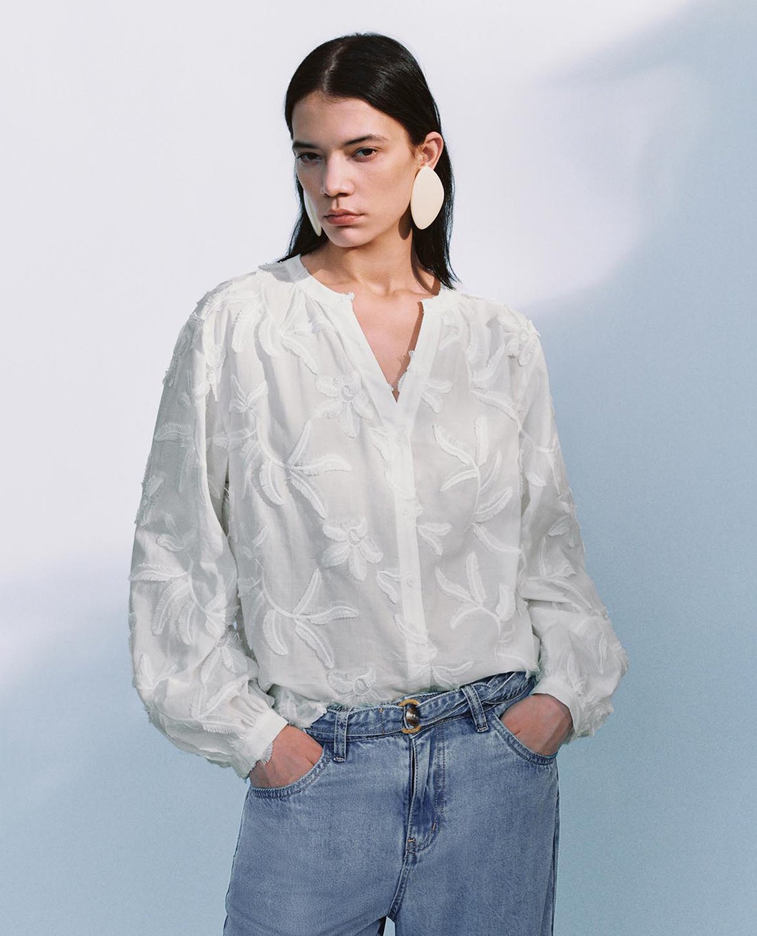Áo kiểu nữ cổ V tay phồng thêu nổi