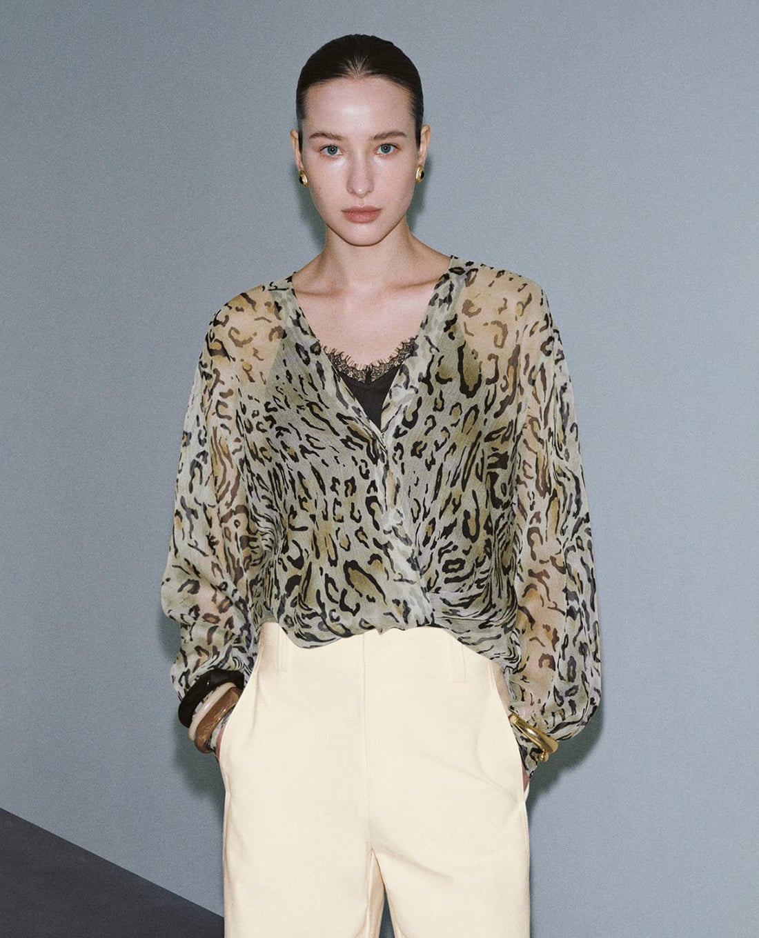 Áo kiểu nữ cổ V xuyên thấu họa tiết da báo