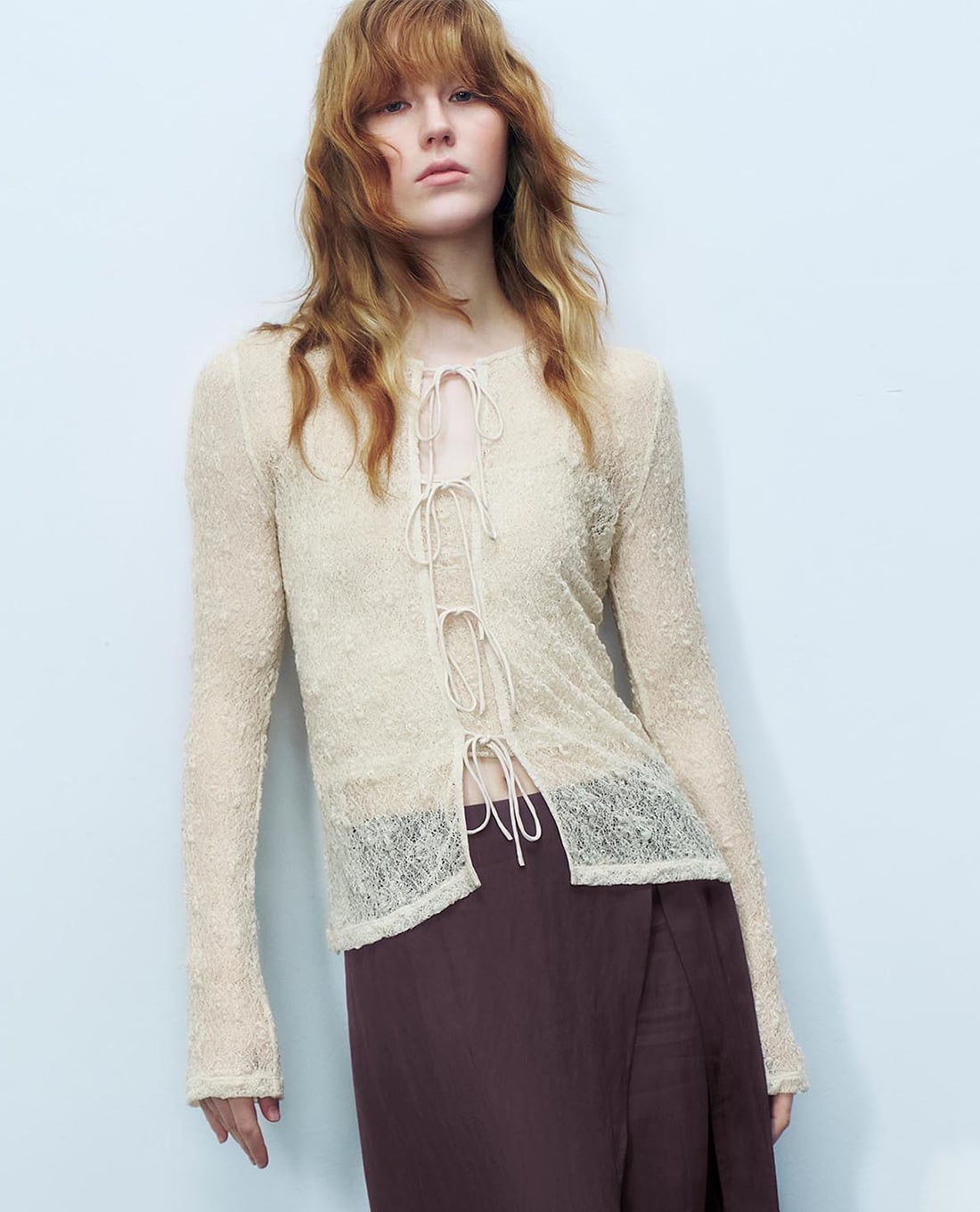 Áo kiểu nữ tay dài xuyên thấu buộc dây