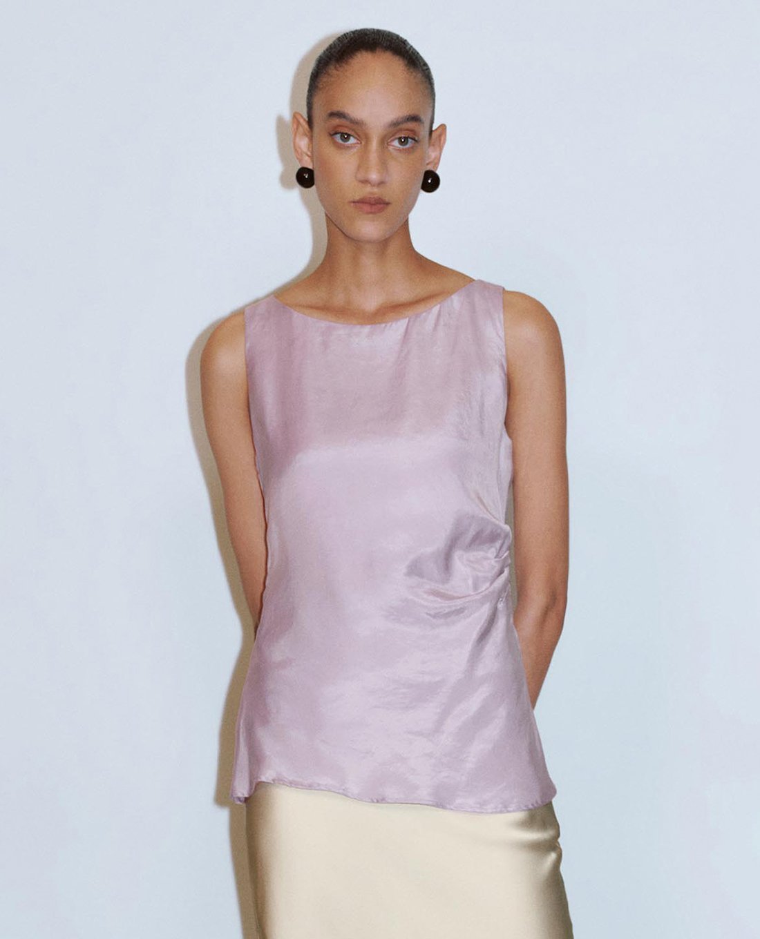 • Thiết kế xếp nhún bên hông và vạt lệch hiện đại