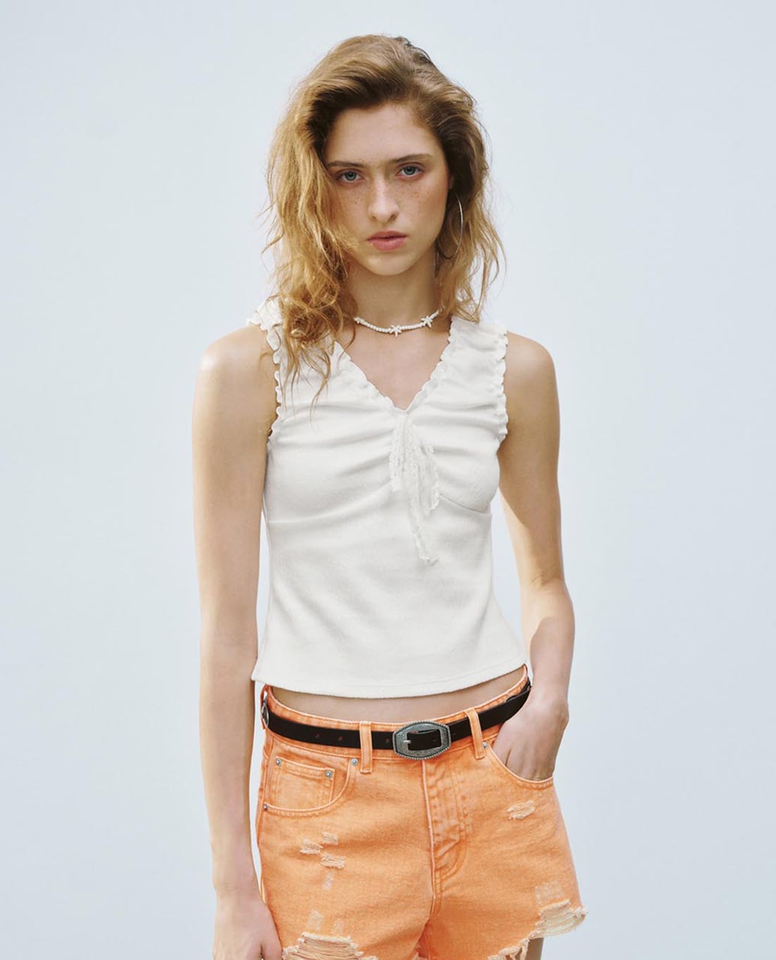 Áo sát nách nữ cổ V nhún bèo phối dây rút