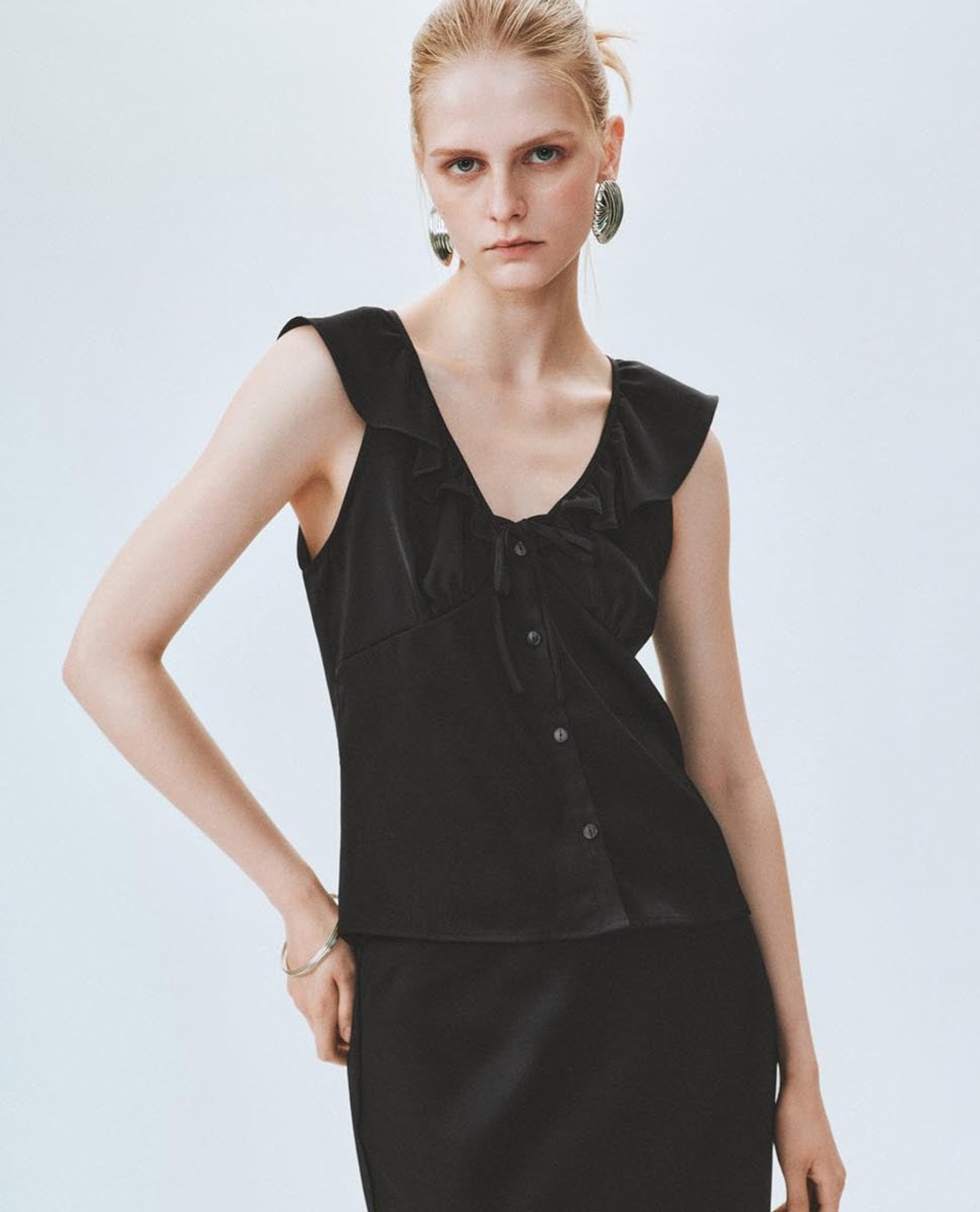 Áo sát nách nữ cổ V phối bèo buộc nơ