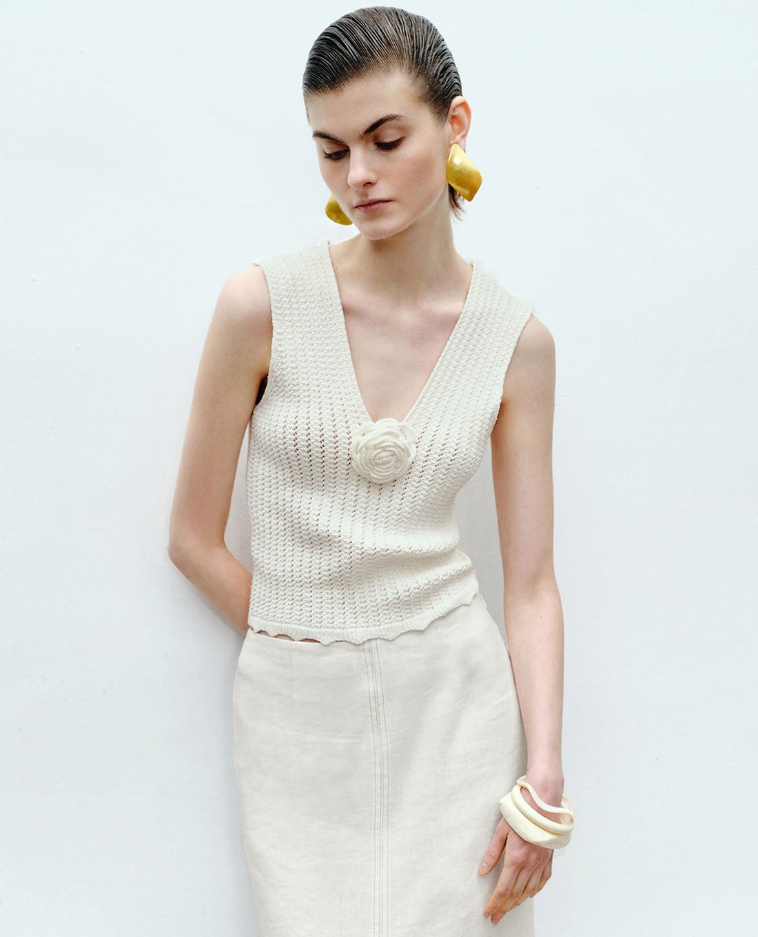 Áo sát nách nữ dệt kim cổ V phối hoa
