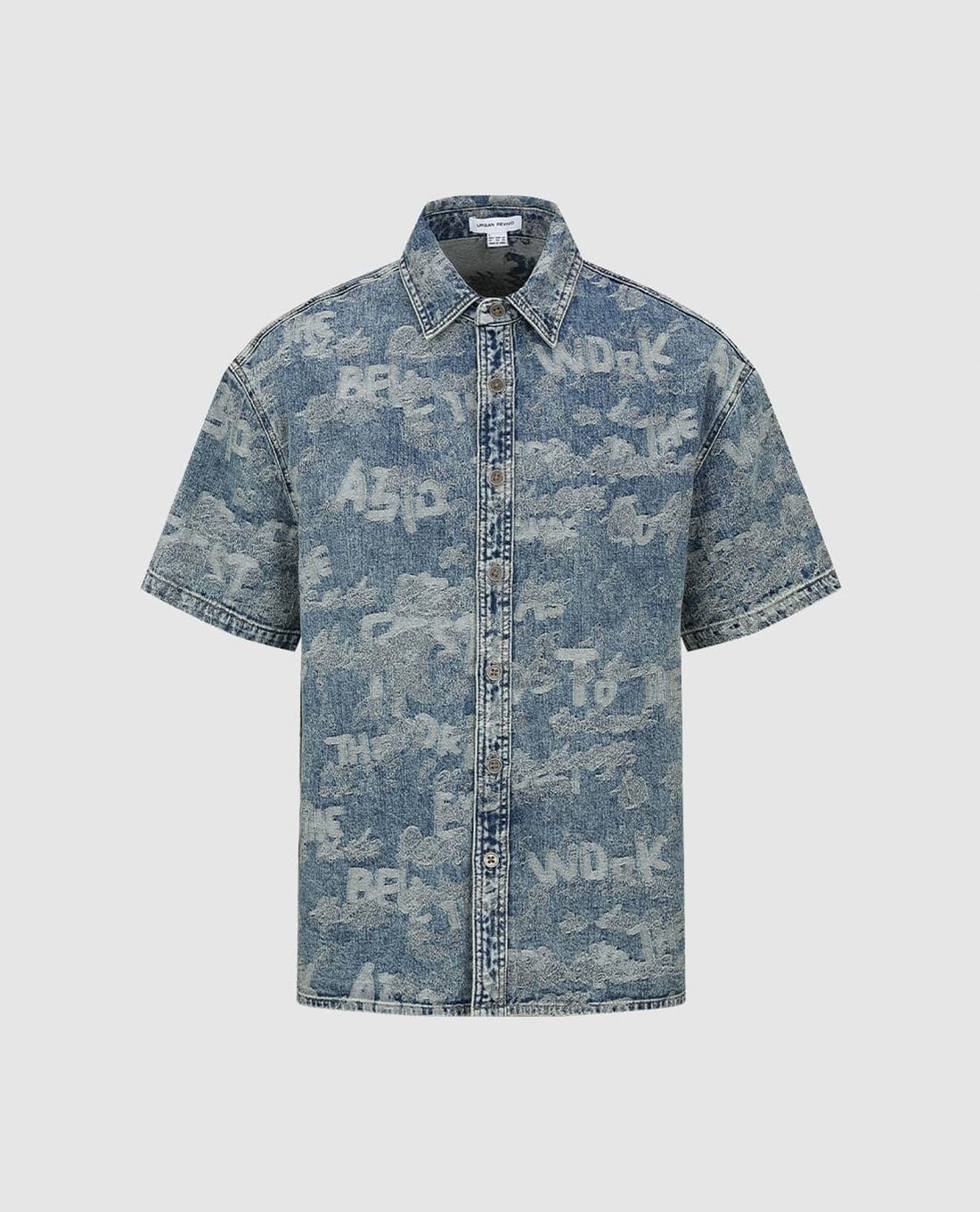 Áo sơ mi denim nam cổ bẻ tay ngắn họa tiết chữ