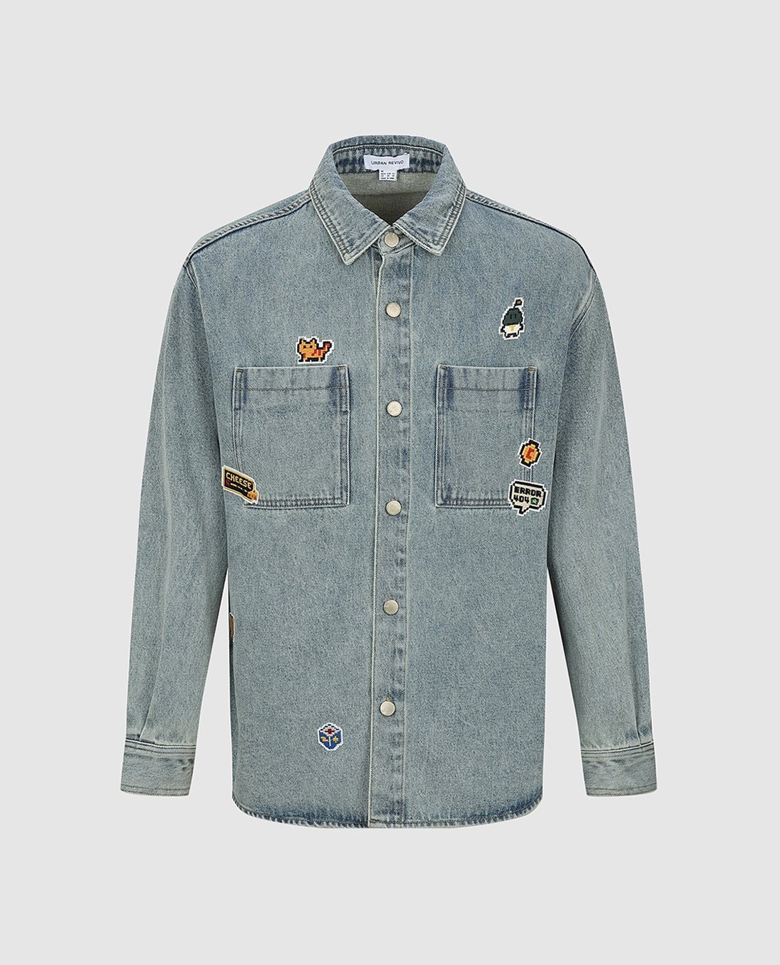Áo sơ mi denim nam tay dài họa tiết stickers