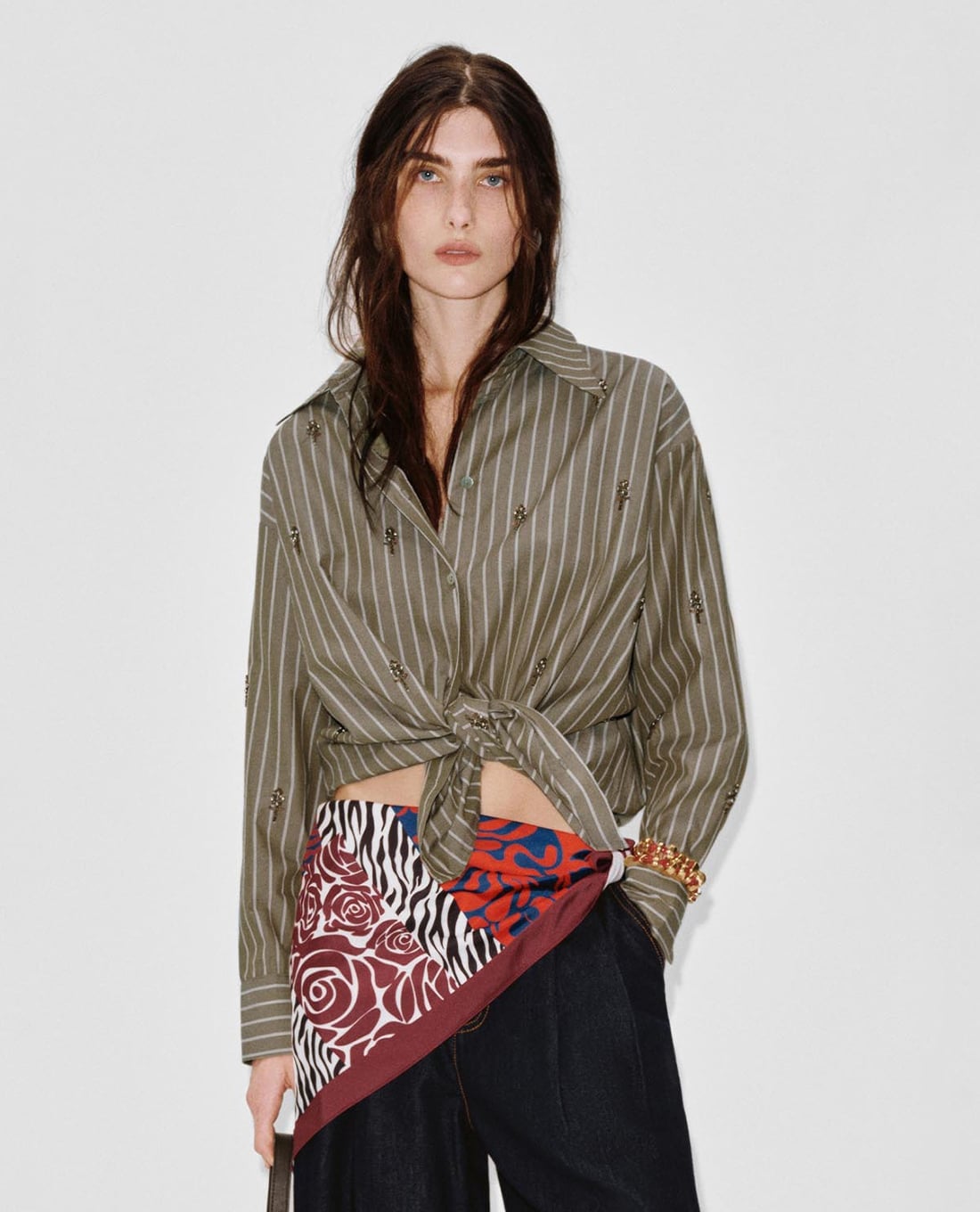 Áo sơ mi nữ cổ bẻ tay dài kẻ sọc đính hạt