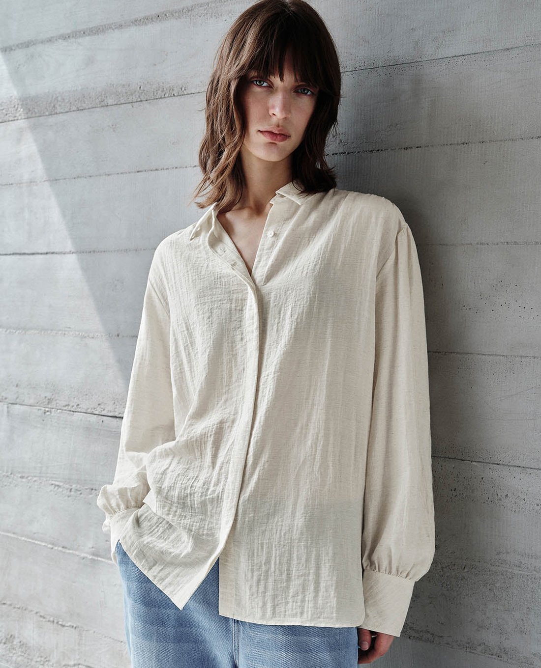 - Cổ áo đứng lịch sự, tay dài bo nhẹ tạo độ phồng tinh tế