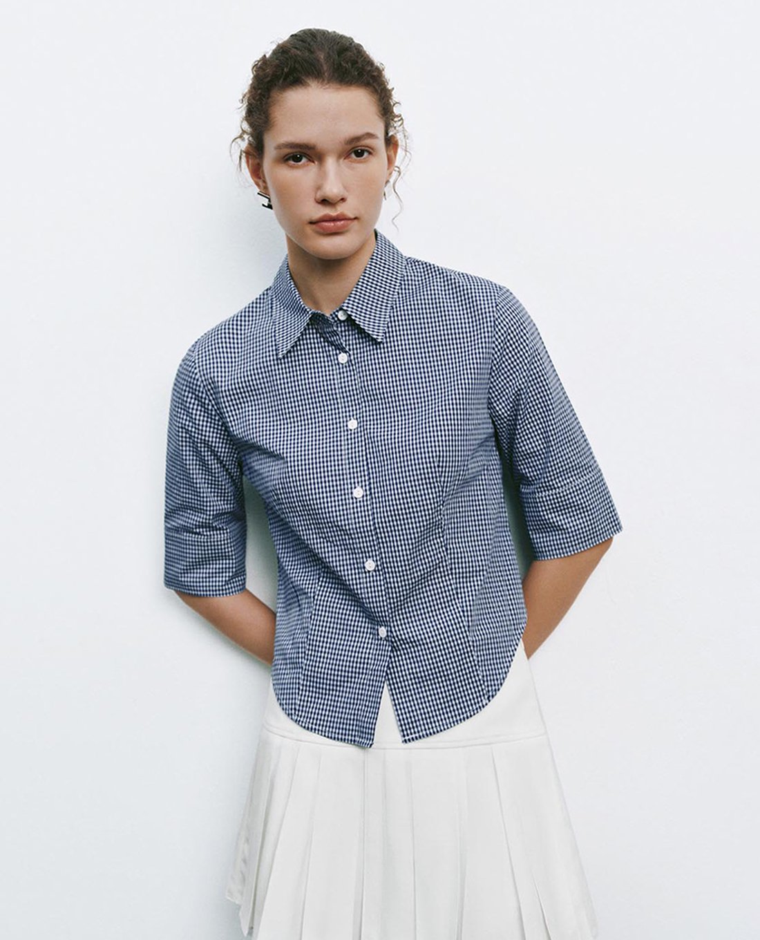 Áo sơ mi nữ cổ bẻ tay lửng phối caro
