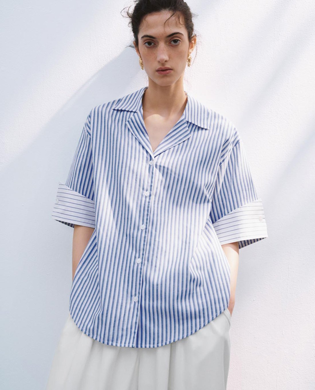 Áo sơ mi nữ cổ bẻ tay lửng phối sọc