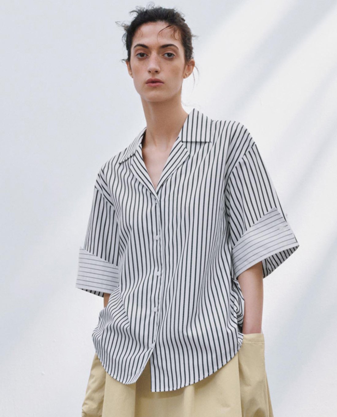 - Cổ bẻ, tay lửng phối sọc thanh lịch