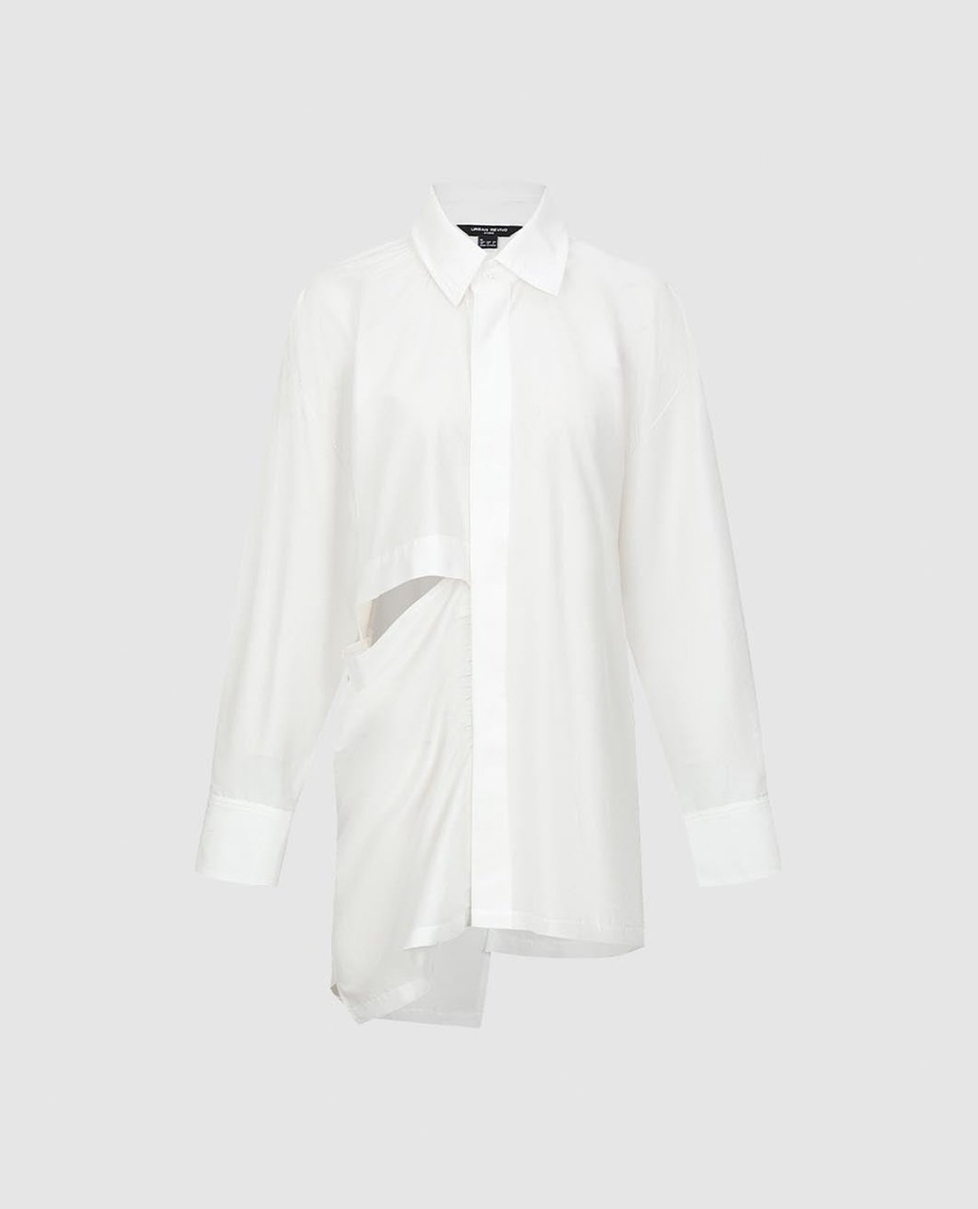- Vạt áo được xếp nếp và kéo dài tạo phom dáng lạ mắt