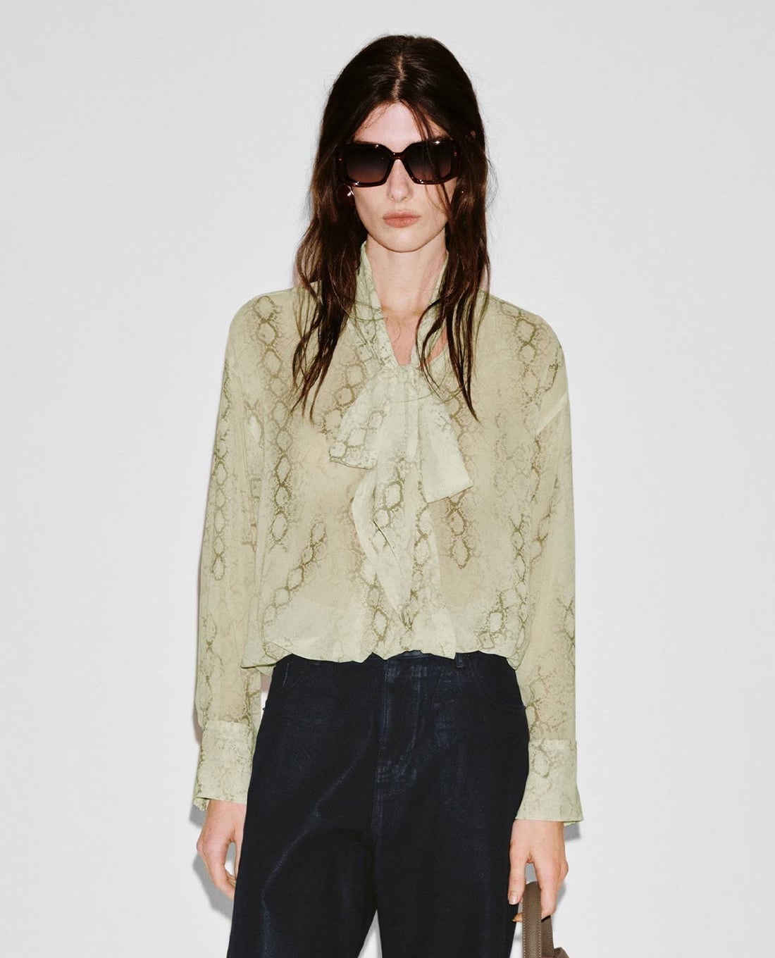 Áo sơ mi nữ tay dài cổ buộc nơ họa tiết da rắn