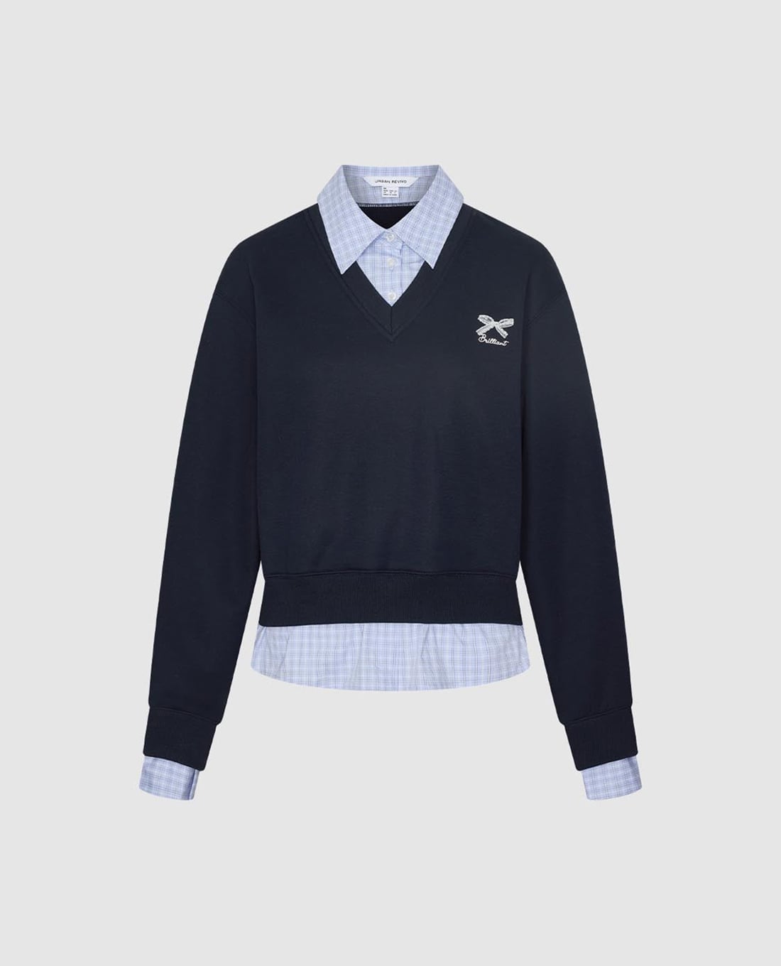 Áo sweatshirt nữ tay dài phối sơ mi kẻ sọc