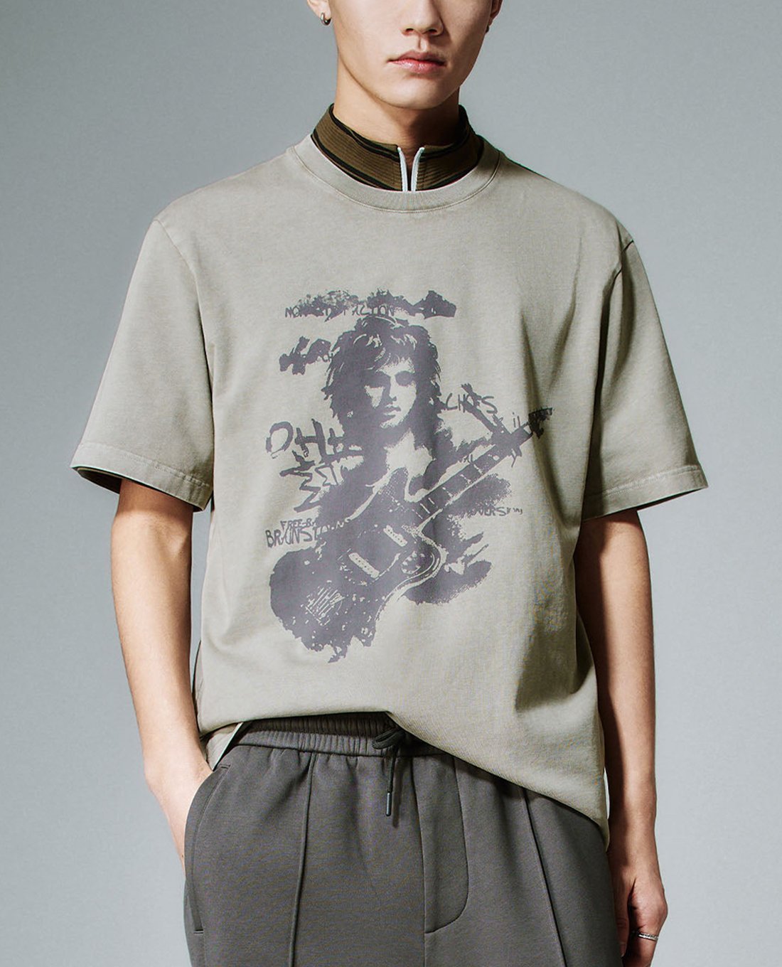 - Hình in nghệ sĩ cầm đàn guitar mang tinh thần rock cổ điển