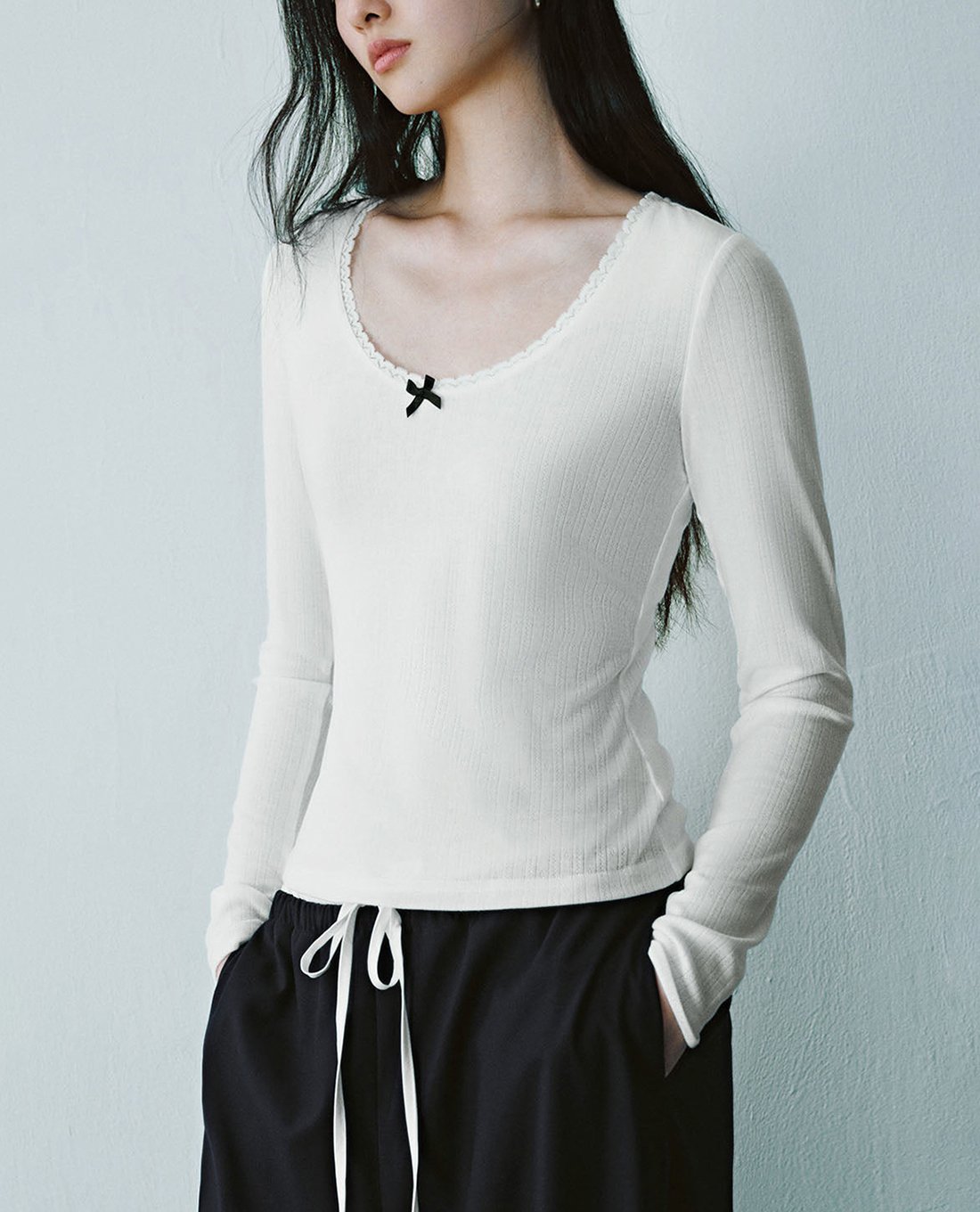 - Cổ tròn phối viền ren, đính nơ nhỏ xinh xắn