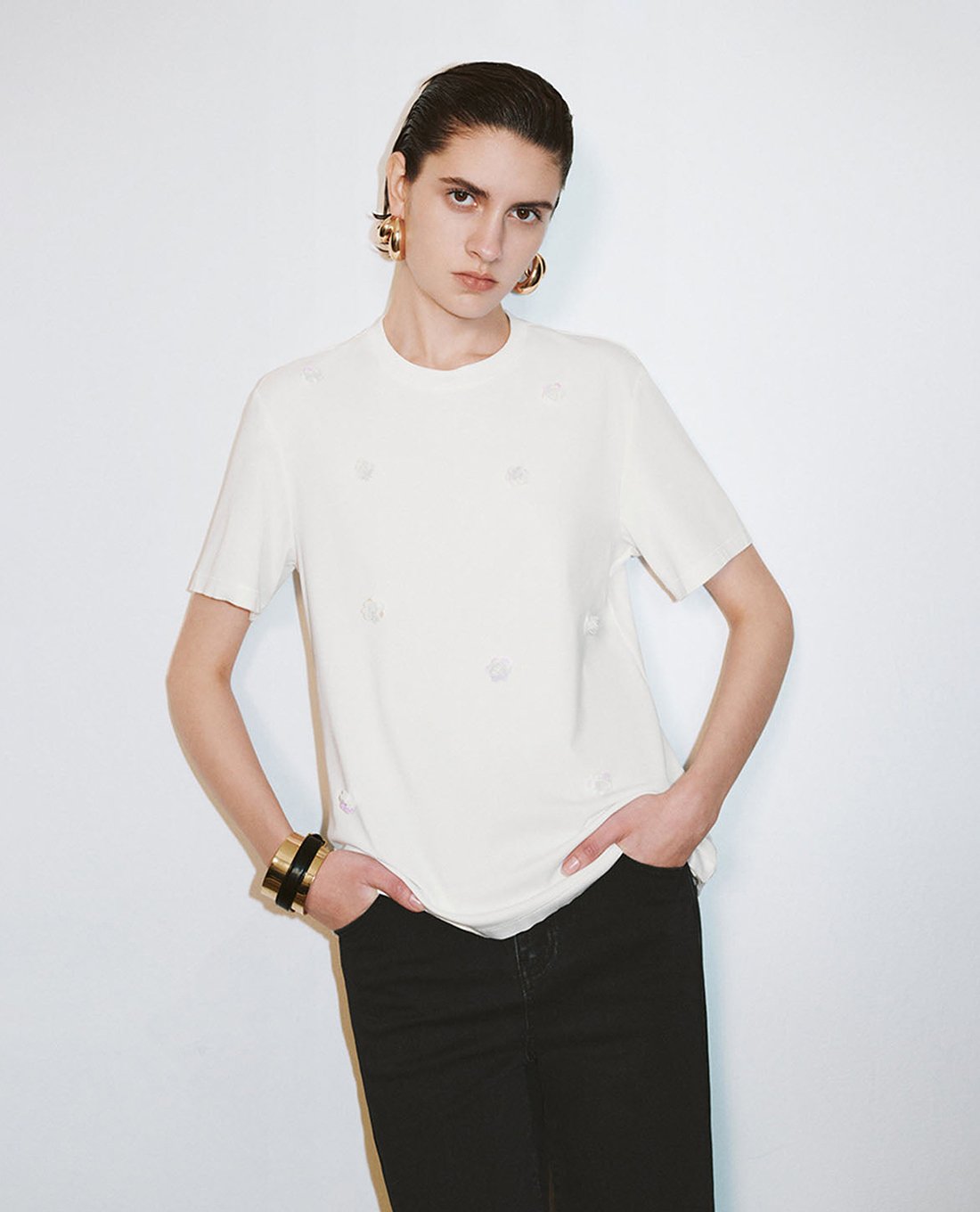 Áo thun nữ cổ tròn tay ngắn đính hoa