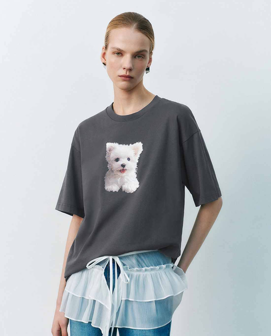 - Hình in chú chó trắng nổi bật mang lại cảm giác dễ thương, trẻ trung