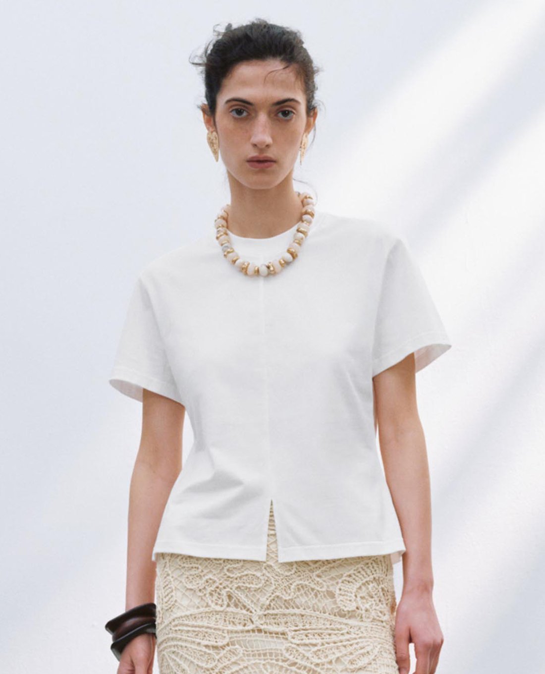 - Kiểu dáng tay ngắn cùng đường cắt xẻ nhẹ phía trước tạo điểm nhấn lạ mắt