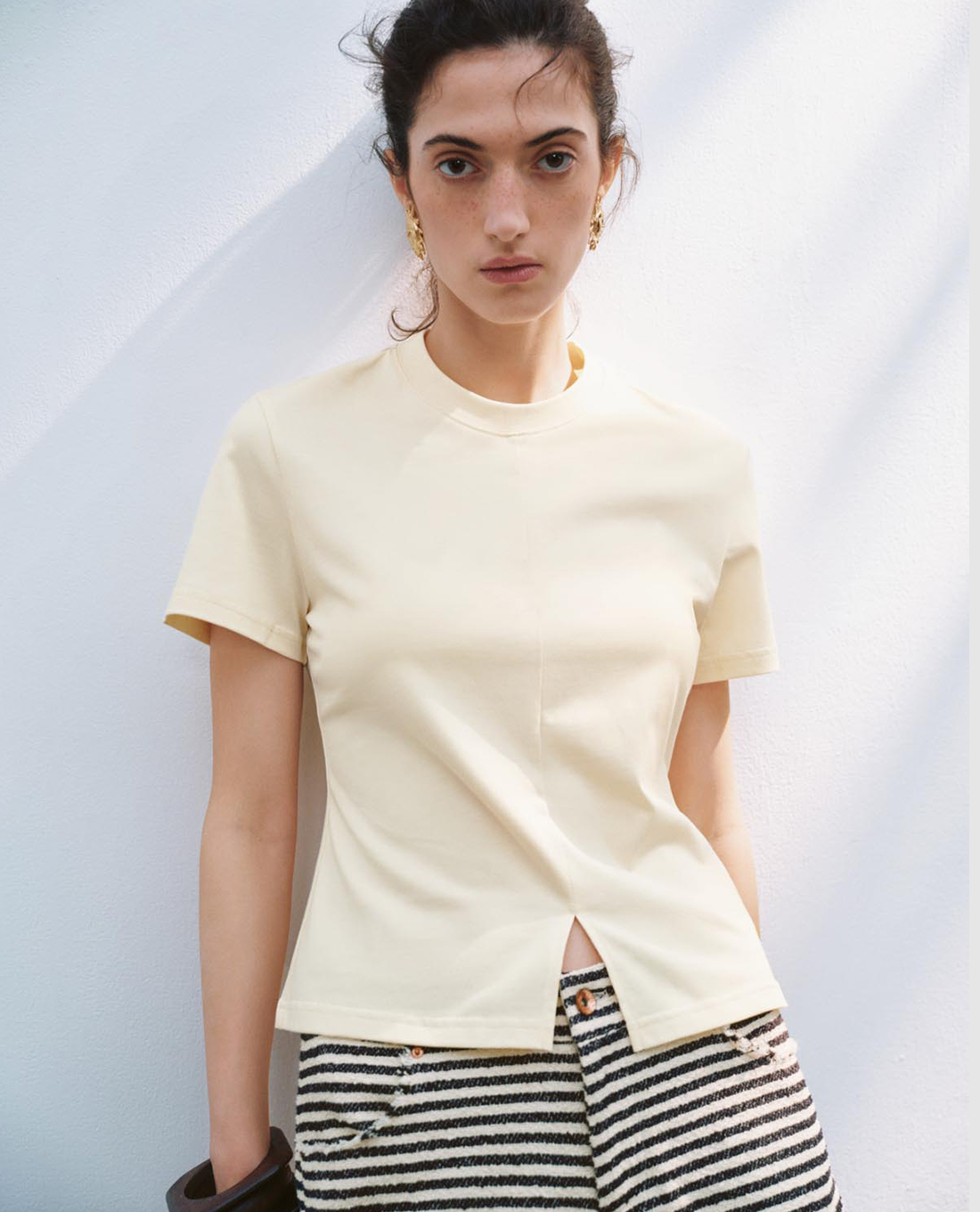 - Kiểu dáng tay ngắn cùng đường cắt xẻ nhẹ phía trước tạo điểm nhấn lạ mắt