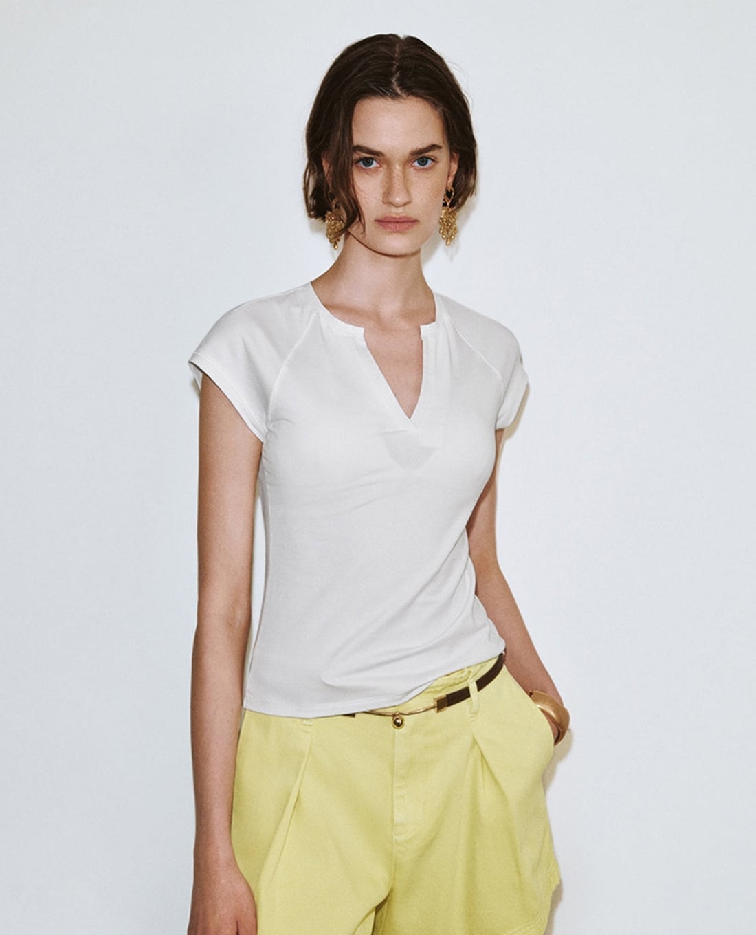 Áo thun nữ cổ V tay ngắn xếp nếp