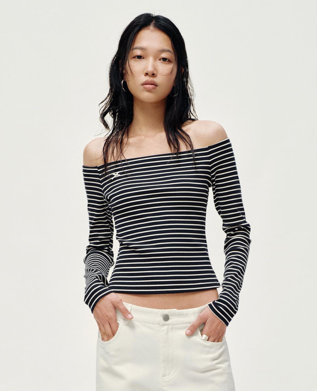 Áo trễ vai nữ tay dài phom ôm kẻ sọc