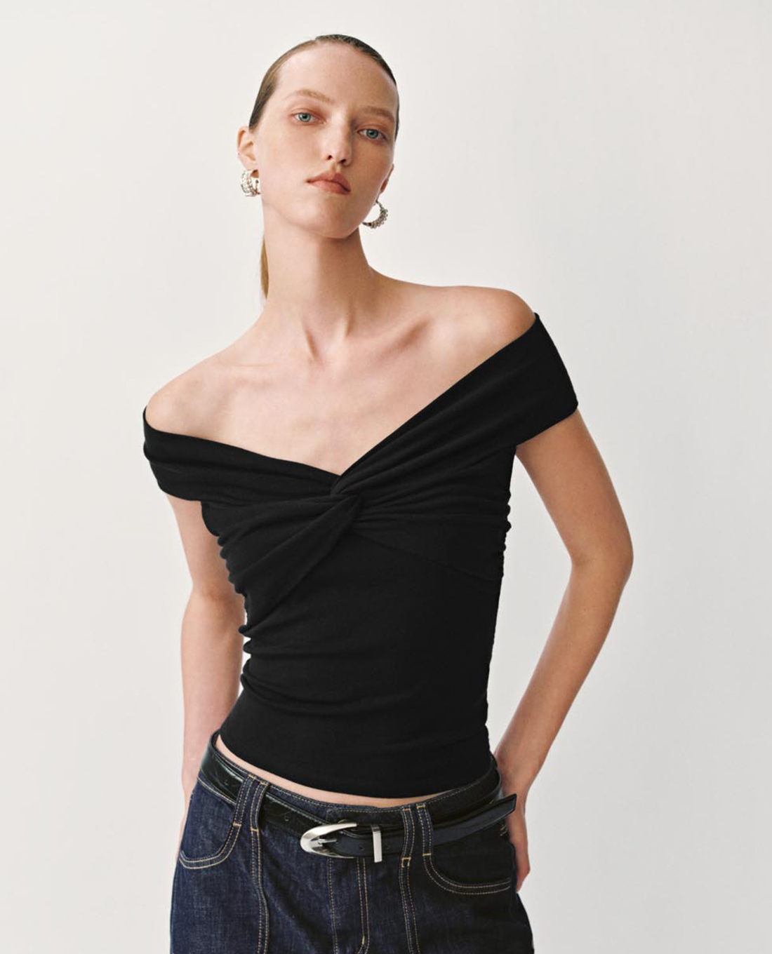 - Thiết kế trễ vai quyến rũ với chi tiết vắt chéo trước ngực tạo điểm nhấn nổi bật