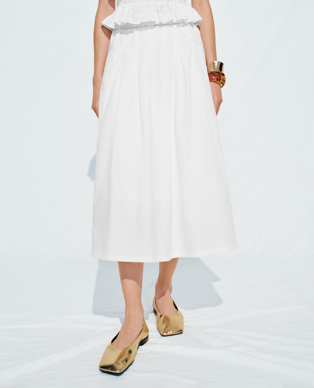 • Phom midi dài qua gối mang lại vẻ thanh lịch, nữ tính