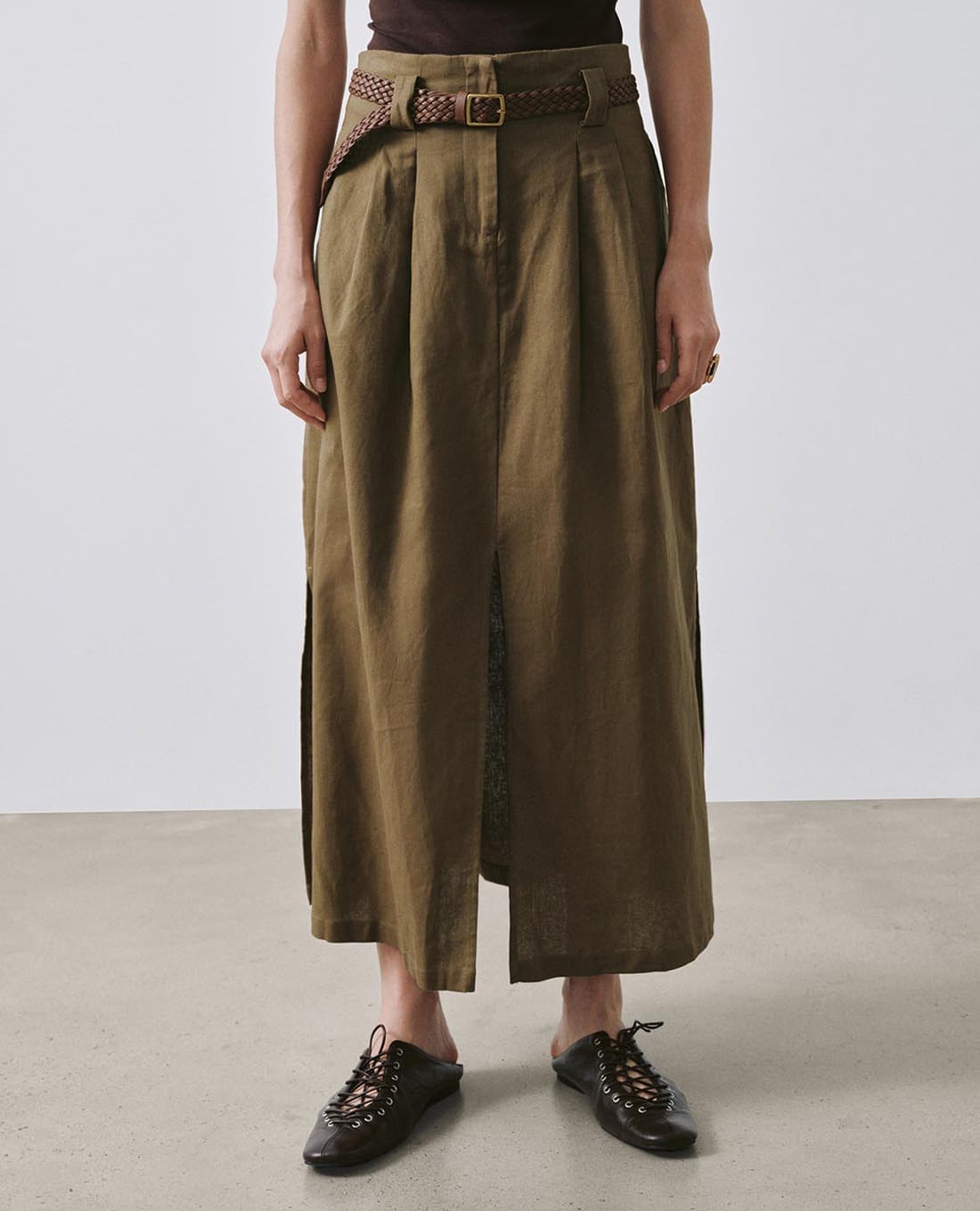Chân váy chữ A midi xẻ tà phối thắt lưng