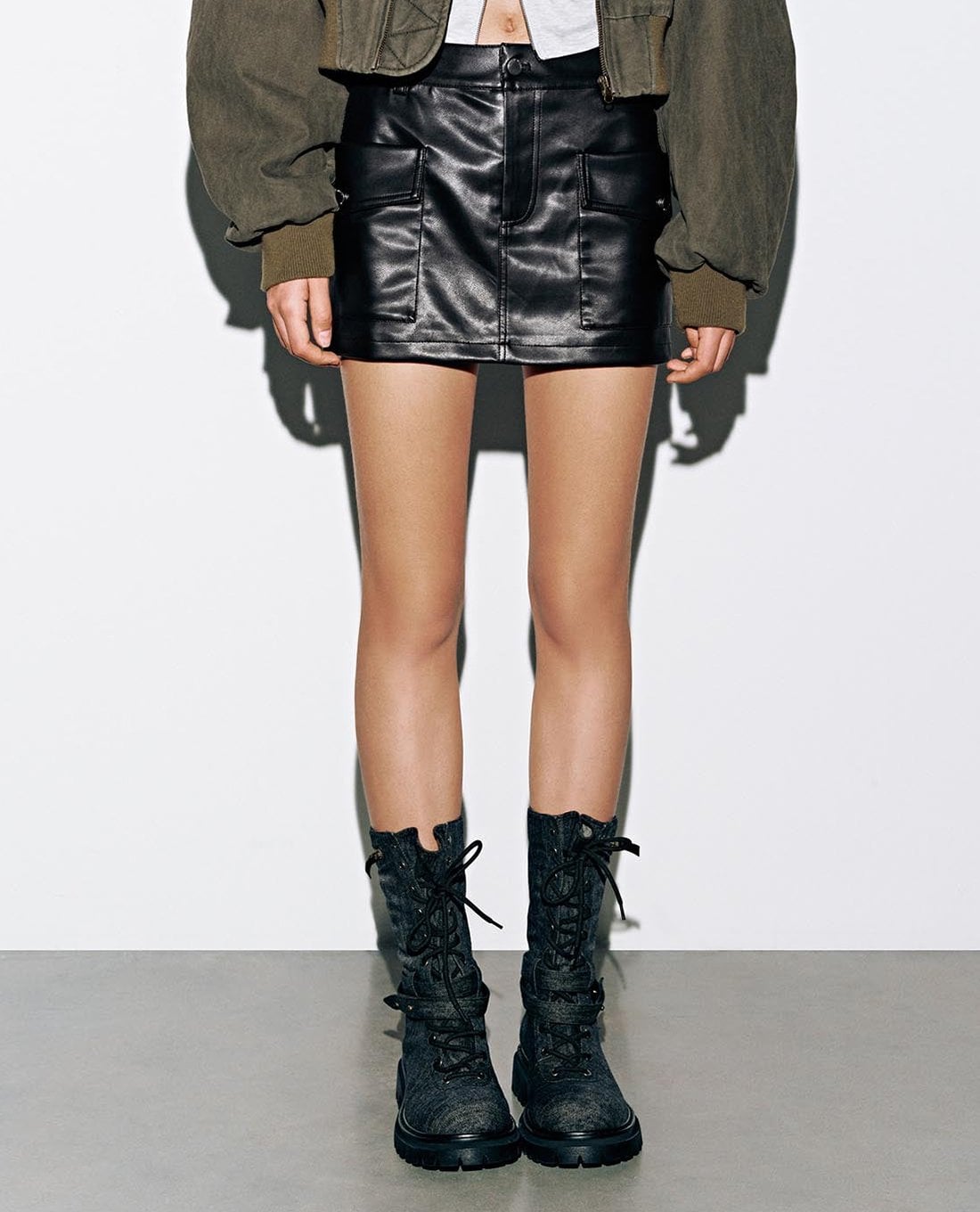 Chân váy chữ A mini da bóng phối túi hộp
