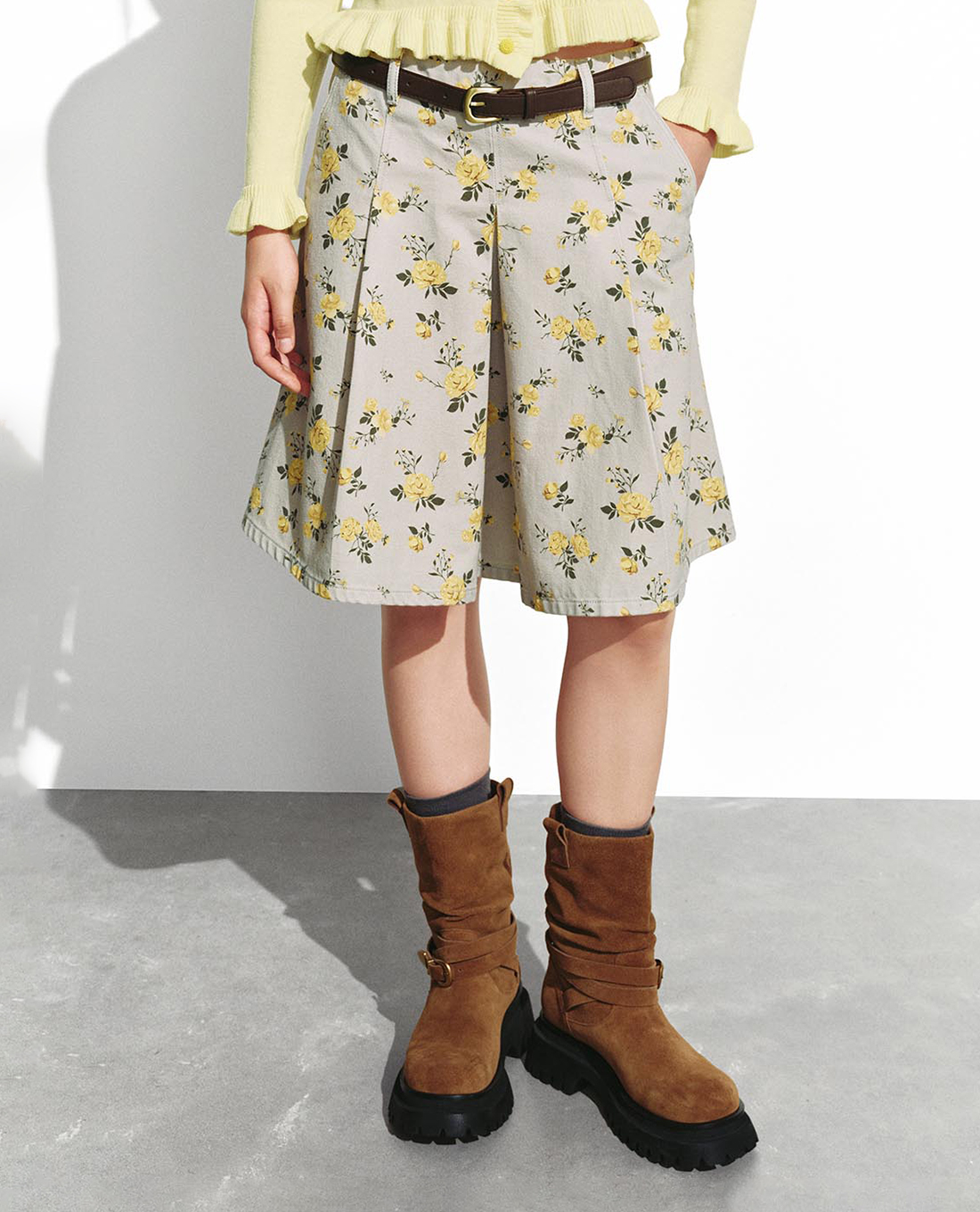 Chân váy denim mini in hoa phối thắt lưng