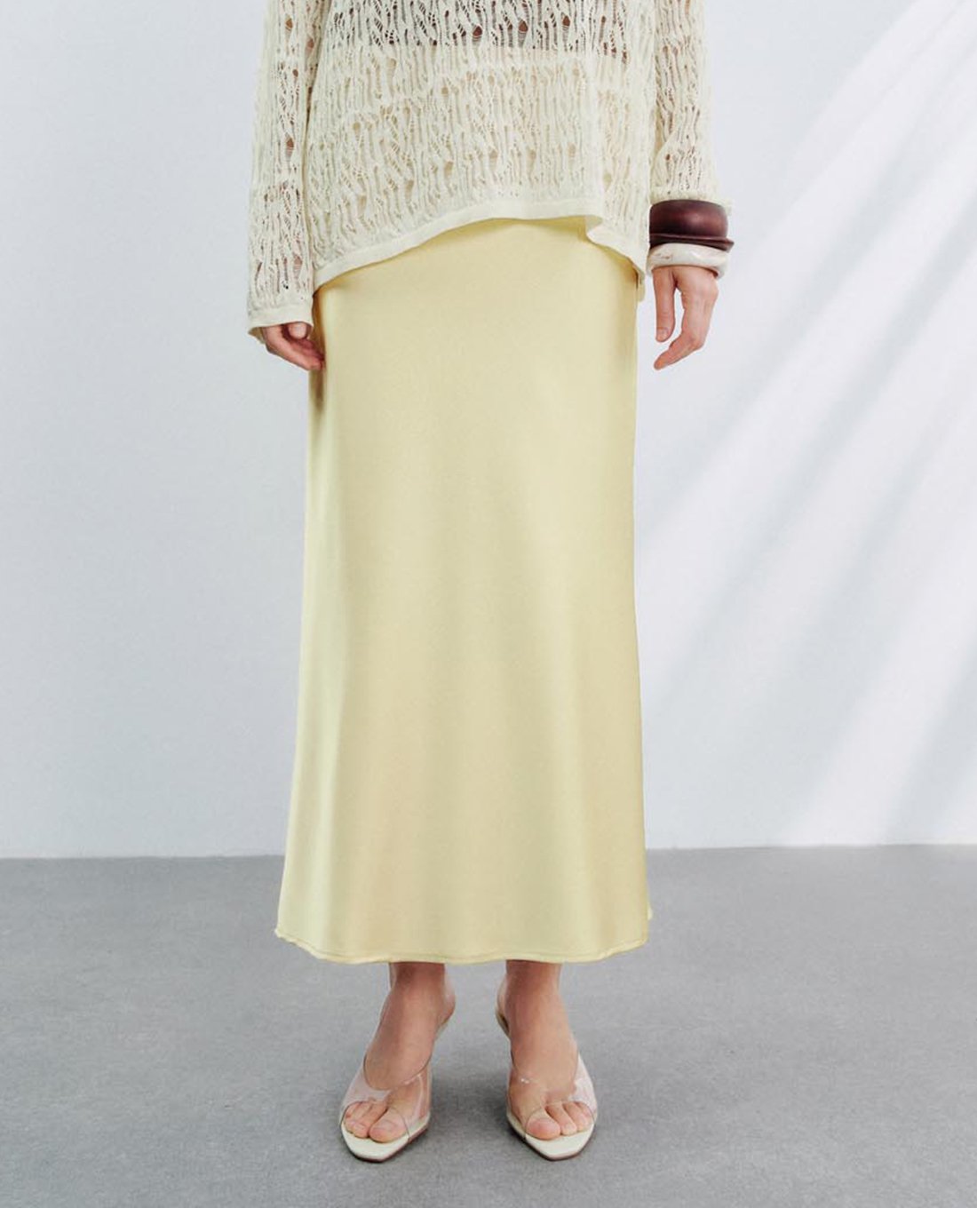 - Chân váy dáng dài, ôm nhẹ phần hông và đùi