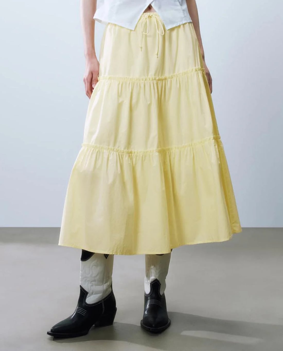 - Dáng midi xòe nhẹ với thiết kế xếp tầng mềm mại