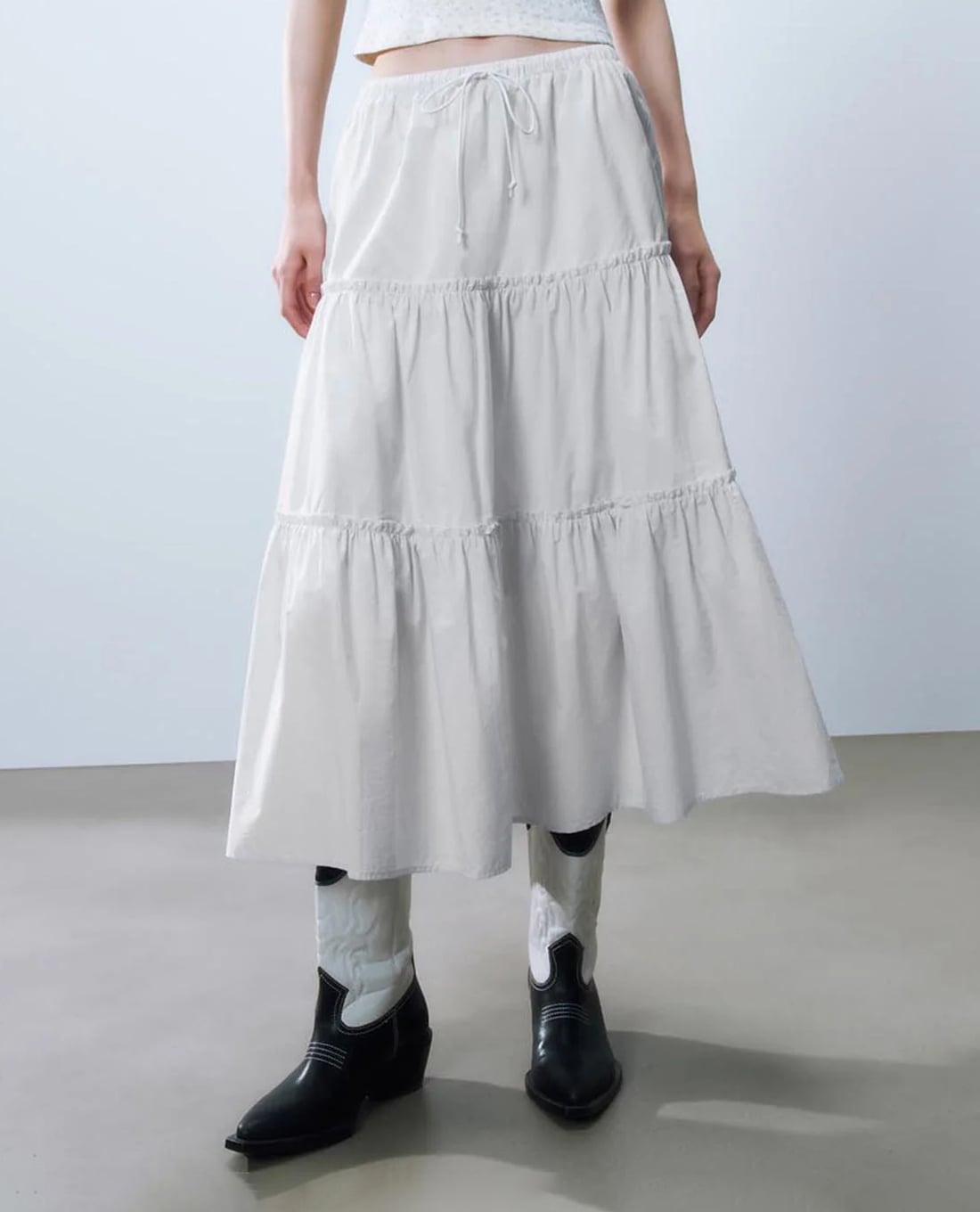 • Dáng midi xòe nhẹ với thiết kế xếp tầng mềm mại