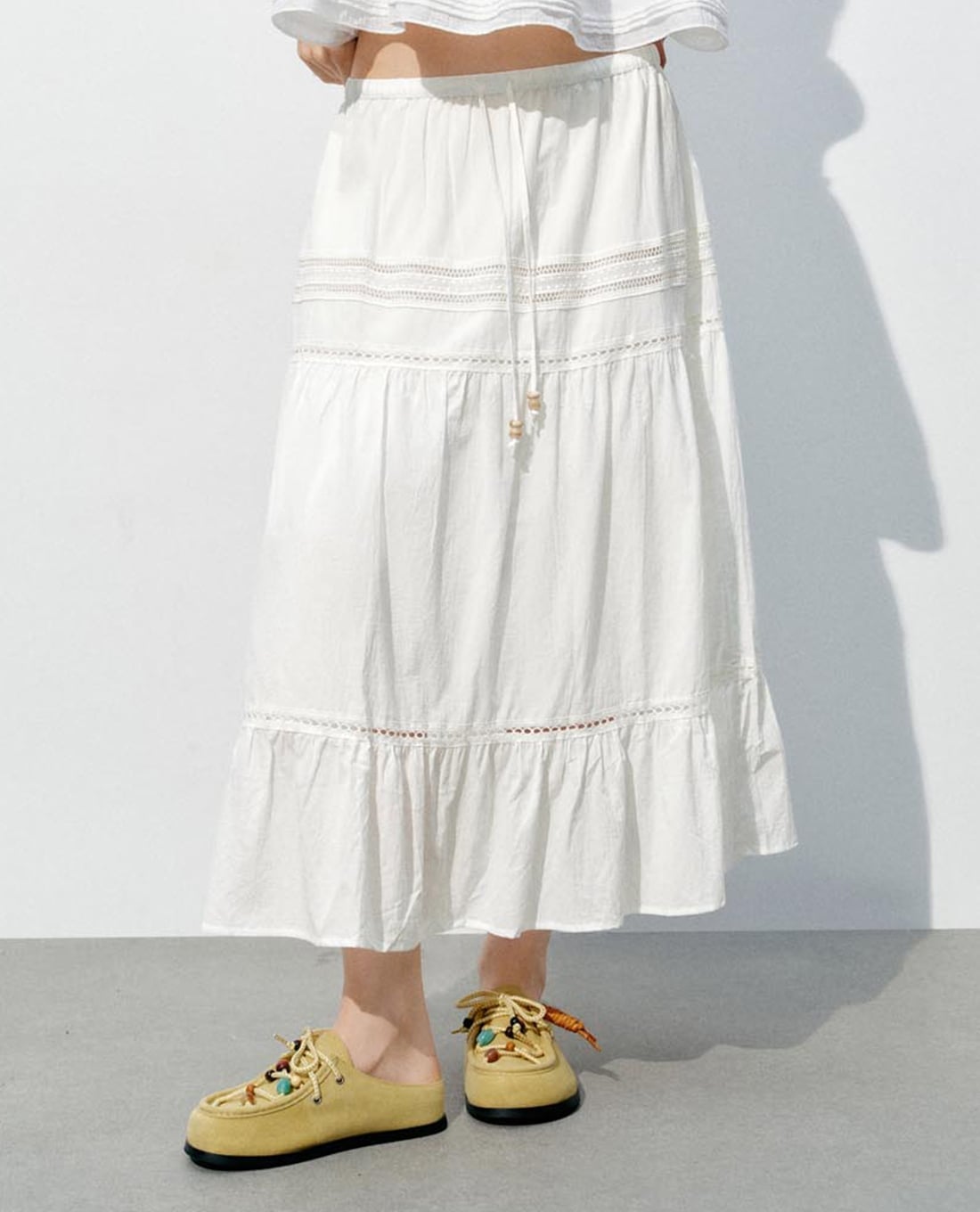 Chân váy xếp tầng midi phối dây rút