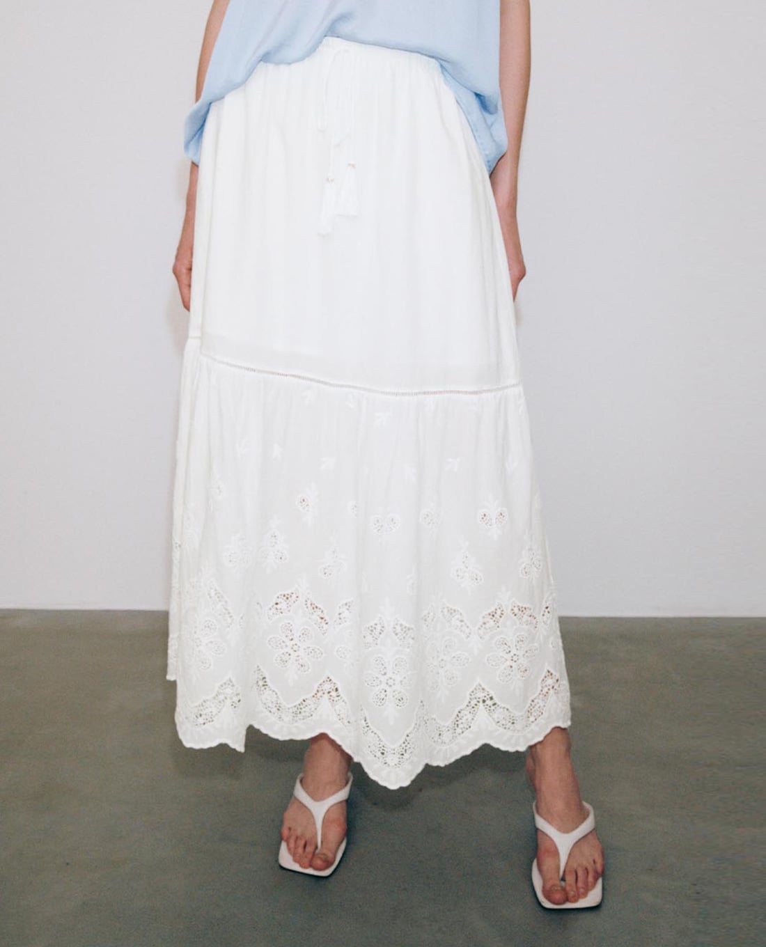 - Chi tiết thêu hoa ở chân váy tạo điểm nhấn tinh tế nổi bật