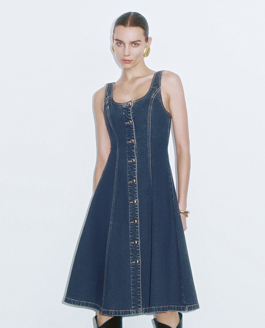 Đầm denim hai dây phom midi quyến rũ A-Line