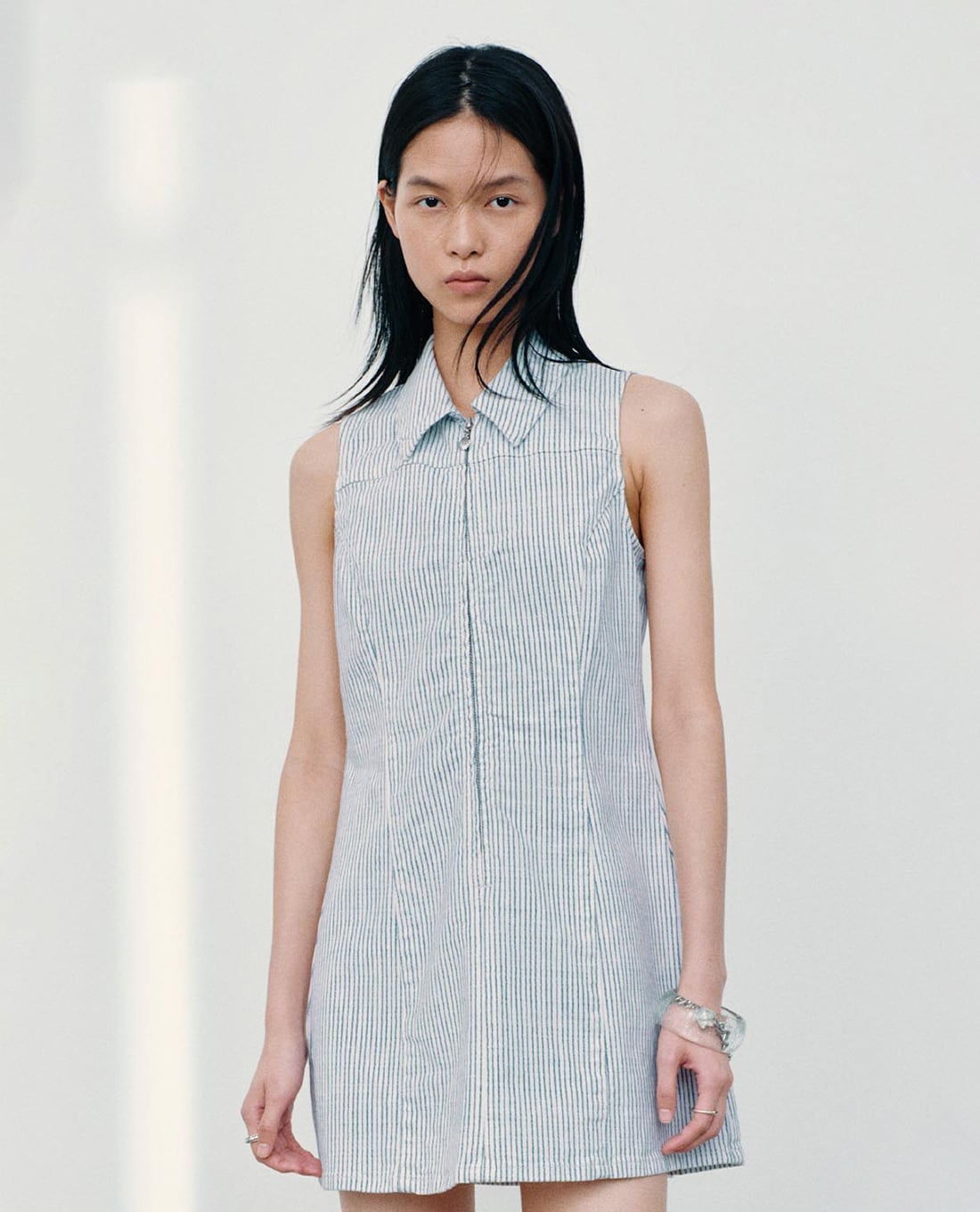 Đầm denim mini sát nách cổ bẻ kẻ sọc