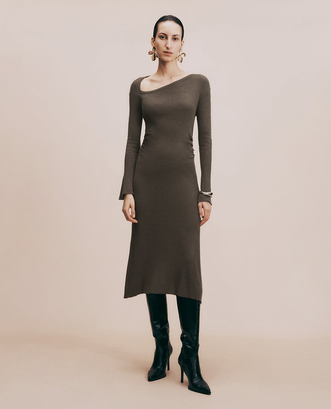 Đầm dệt kim midi trễ vai tay dài phom ôm