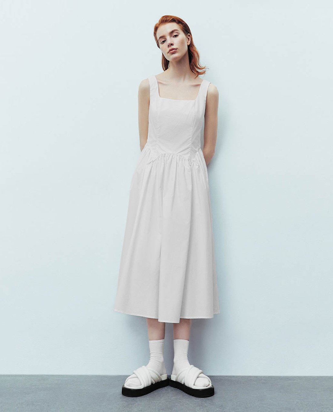 Đầm hai dây midi cổ vuông hiện đại A-Line