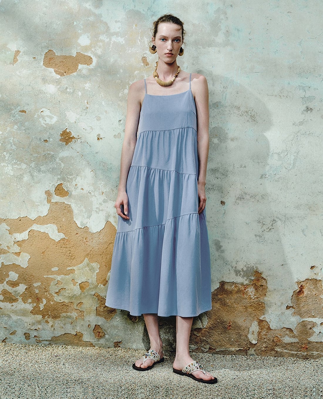 Đầm hai dây midi xếp tầng phom suông