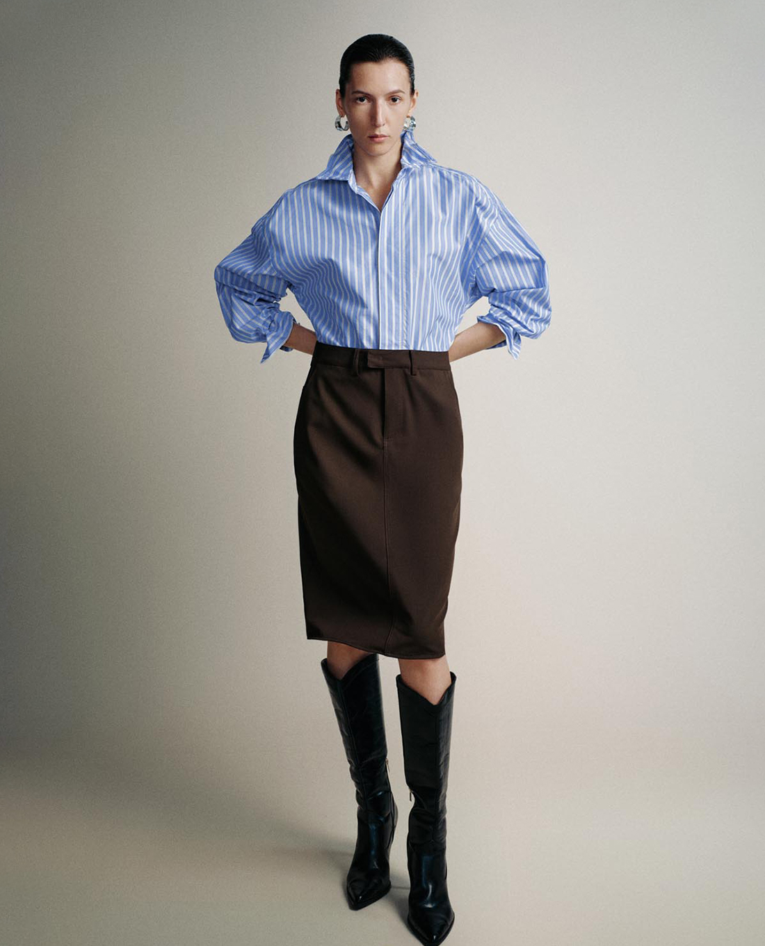 - Thiết kế độc đáo kết hợp áo sơ mi kẻ sọc và chân váy liền thân