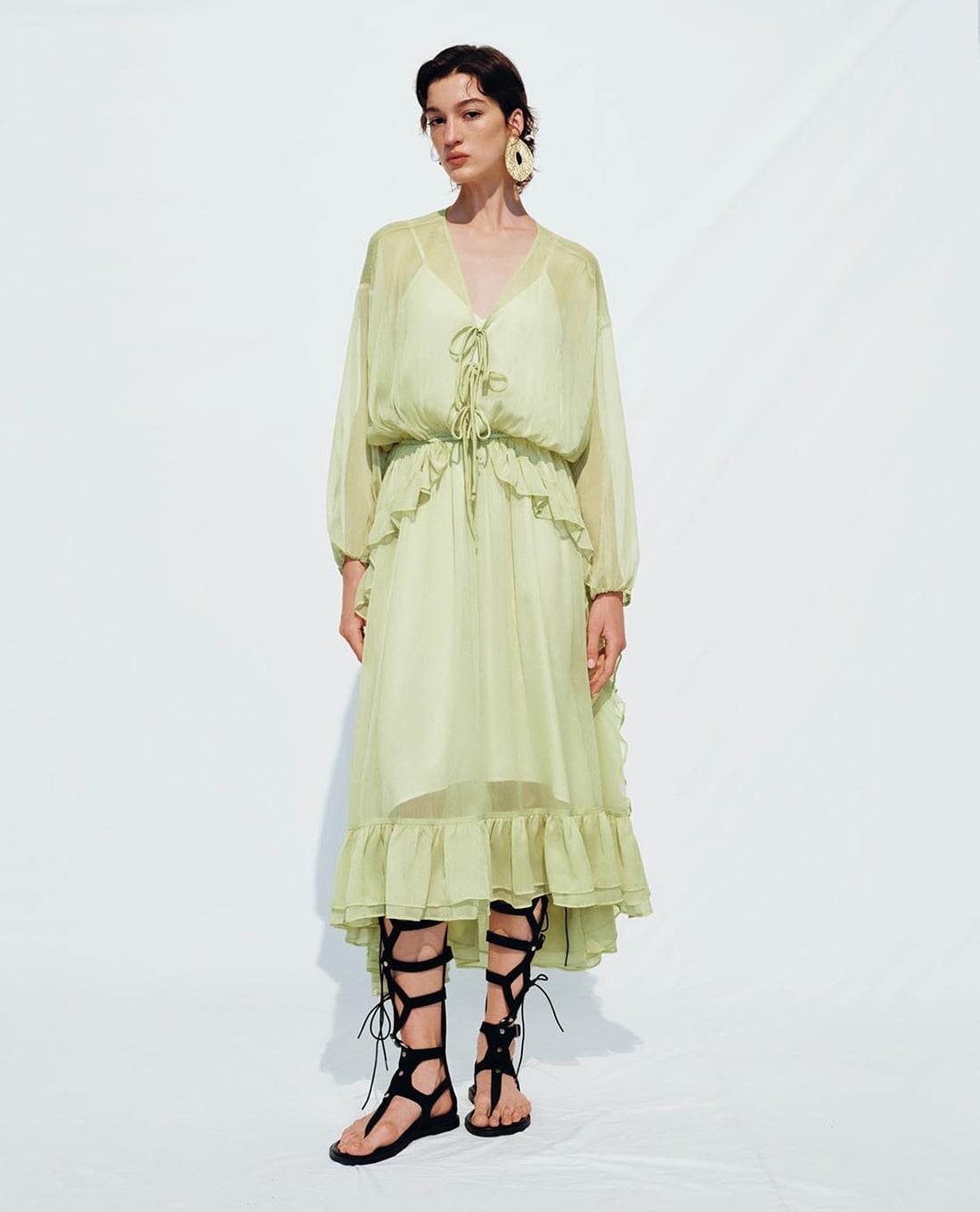 Đầm xếp tầng midi cổ V tay dài nhún bèo