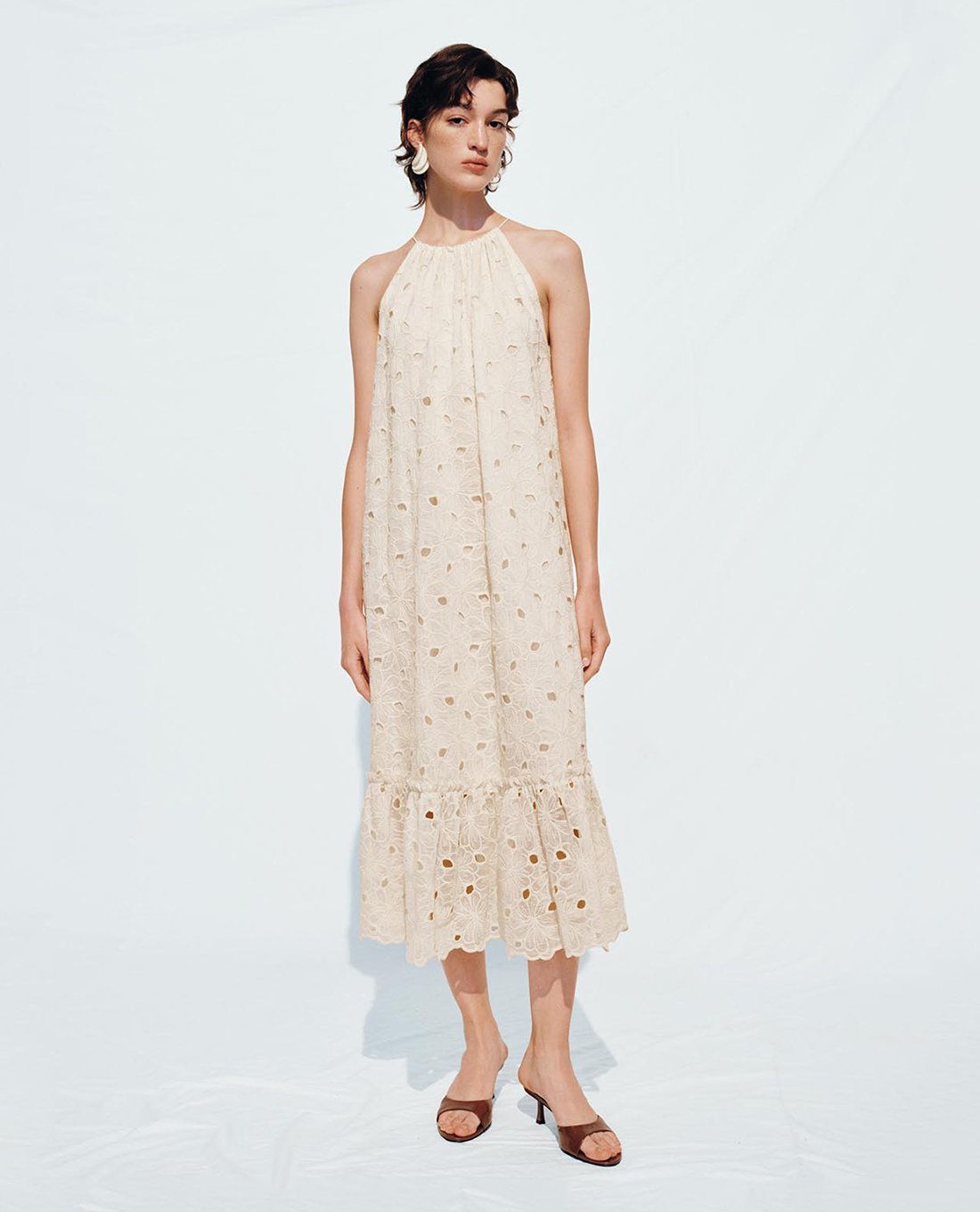 Đầm xếp tầng midi cổ yếm phối ren